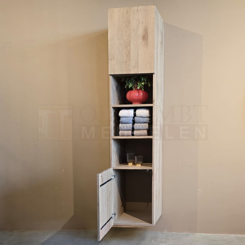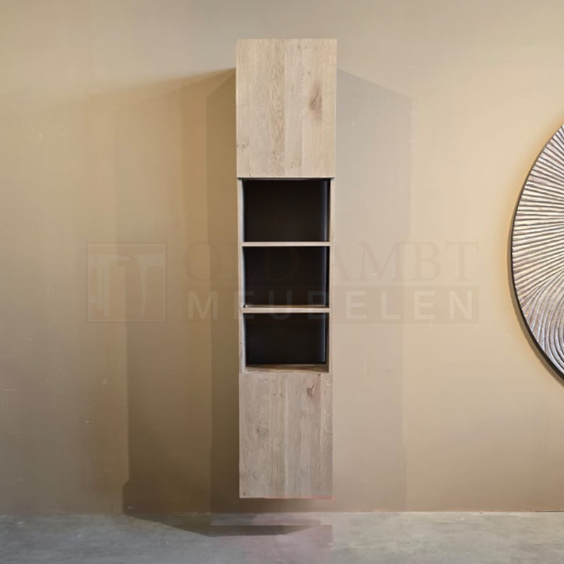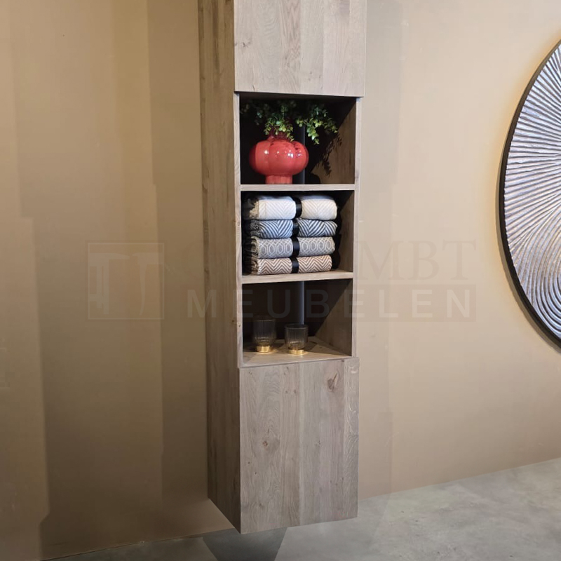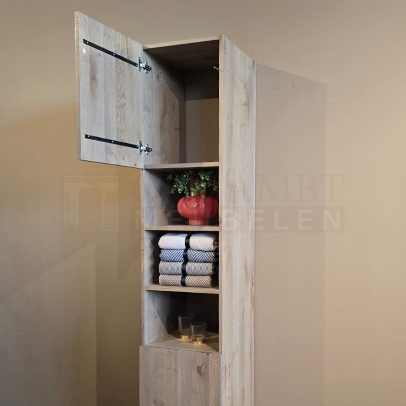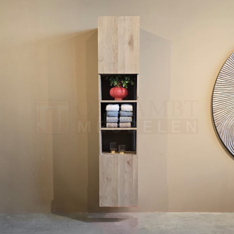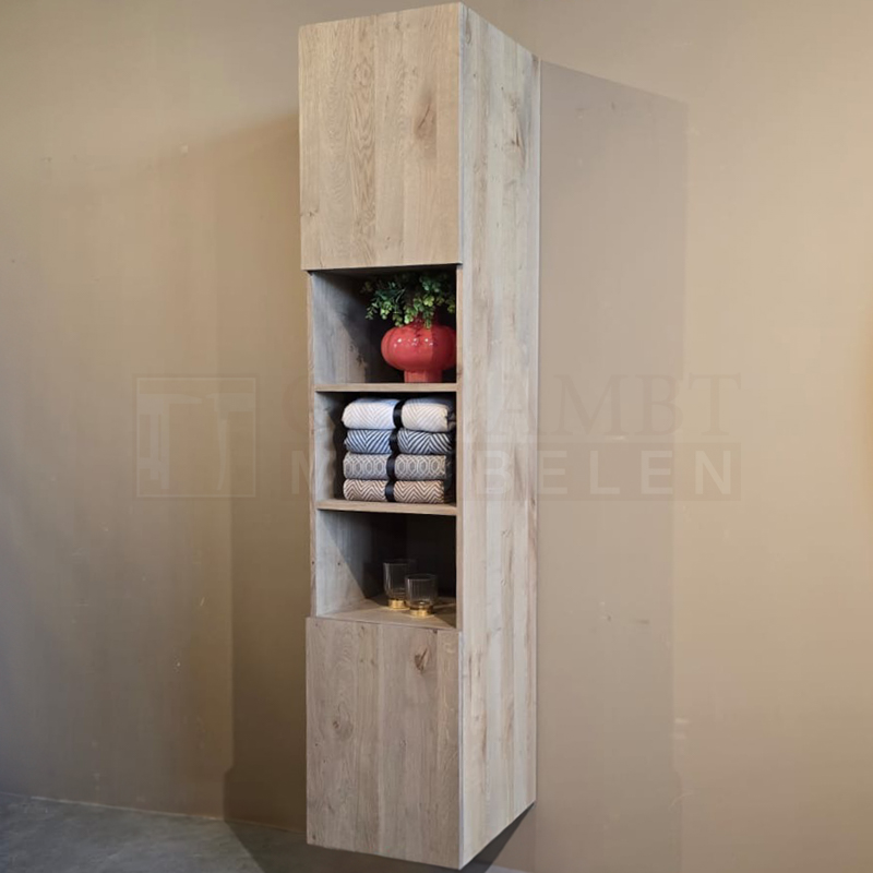Badkamerkast Jenn is gemaakt van massief eiken 2 cm en kan behandeld worden in een door u gewenste kleur. De badkamerkast op de foto is behandeld met 4220 zand. Het meubel wordt afgelakt met een 2k lak (beschermlaag tegen vochtvlekken/kringen) In het midden is de kast voorzien van 3 open vakken met legplank. De deuren van de kast Jenn zijn te openen door een Push to Open systeem.