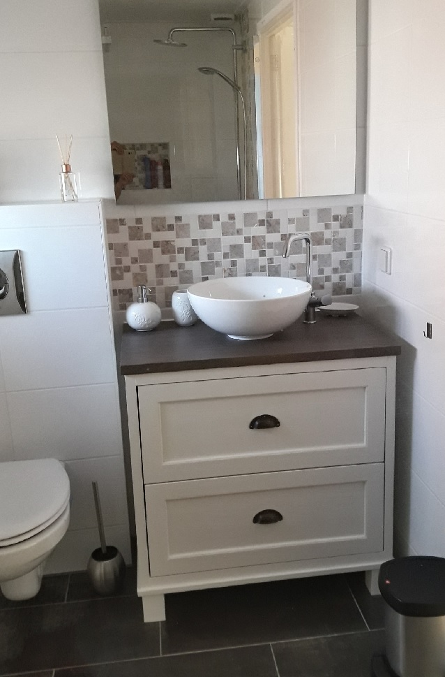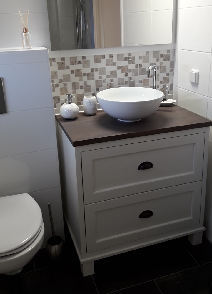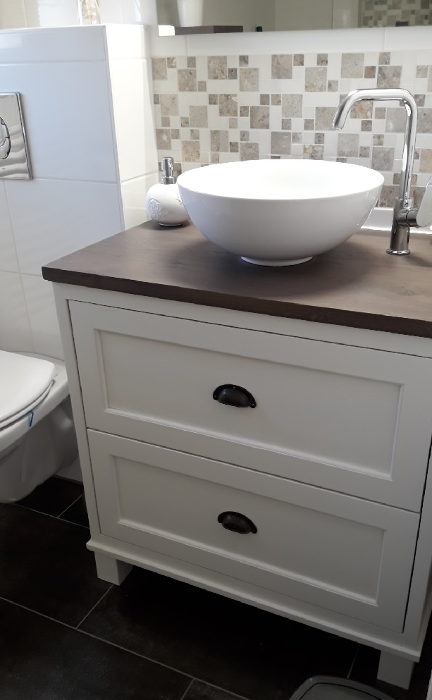 Badkamermeubel Jana is gemaakt van eikenhout en nieuw hout wit (RAL 9001) of zwart (RAL 9005) dekkend geverfd. Het blad kan behandeld worden in een door u gewenste kleur. Het blad op de foto is behandeld met 4112 blauwgrijs. Het meubel wordt afgelakt met een 2k lak (beschermlaag tegen vochtvlekken/kringen). Het meubel heeft 2 laden met standaard ladegeleiders. Het blad steekt aan beide zijdes van het meubel 0,5/0,7 cm over i.v.m. eventuele werking van het meubel.
