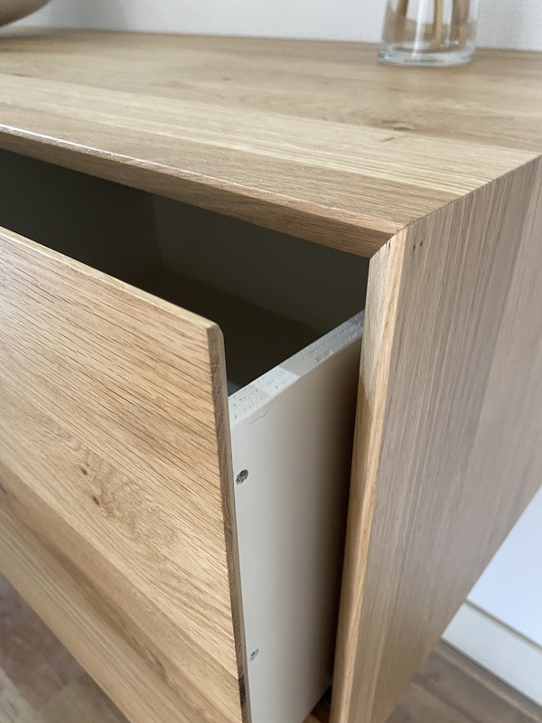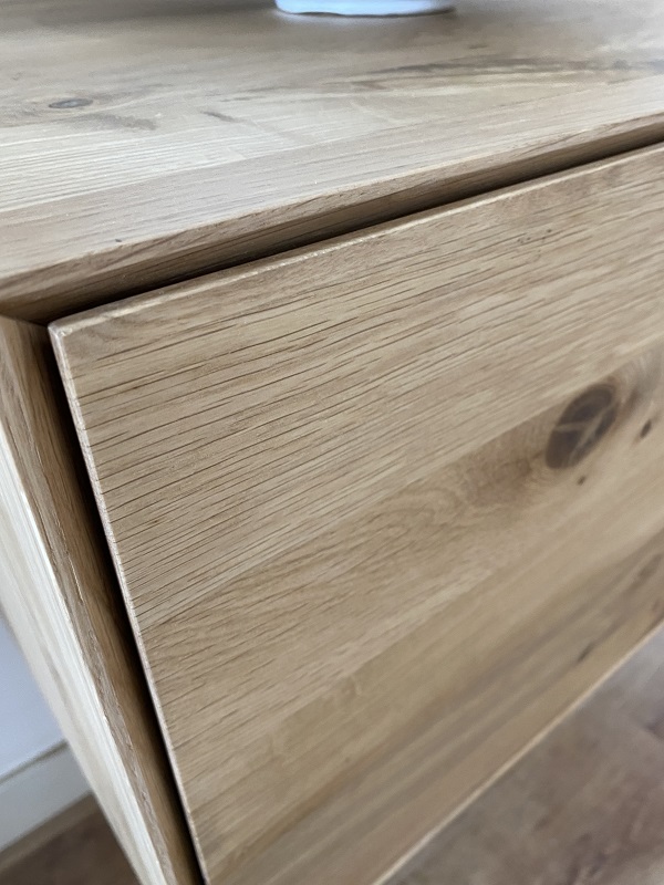 Badkamermeubel Marieke is gemaakt van eikenhout en kan worden behandeld in een door u gewenste kleur. Het meubel op de foto is behandeld met 3000 transparant. Badkamermeubel Marieke wordt afgelakt met een 2k lak (beschermlaag tegen vochtvlekken/kringen). De zijwanden en fronten hebben een schuine zijde. Het frame is ca. 5 mm recht aan de voorzijde en loopt schuin weg. Het meubel heeft 2 laden en zijn standaard voorzien van Push-to-Open ladegeleiders. U kunt ook kiezen voor de combinatie Push-to-Open en Soft-Close.