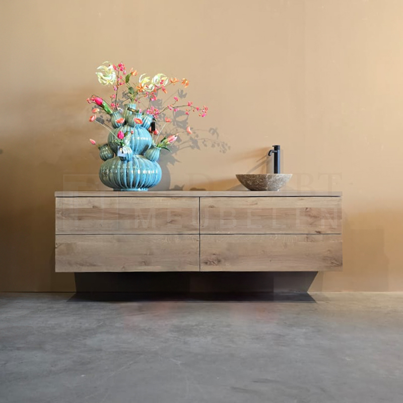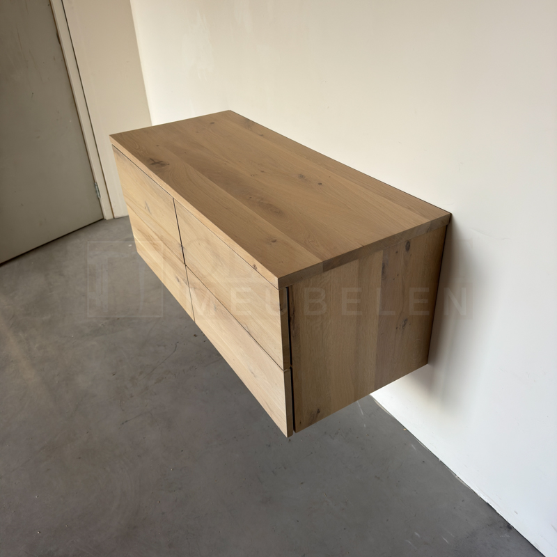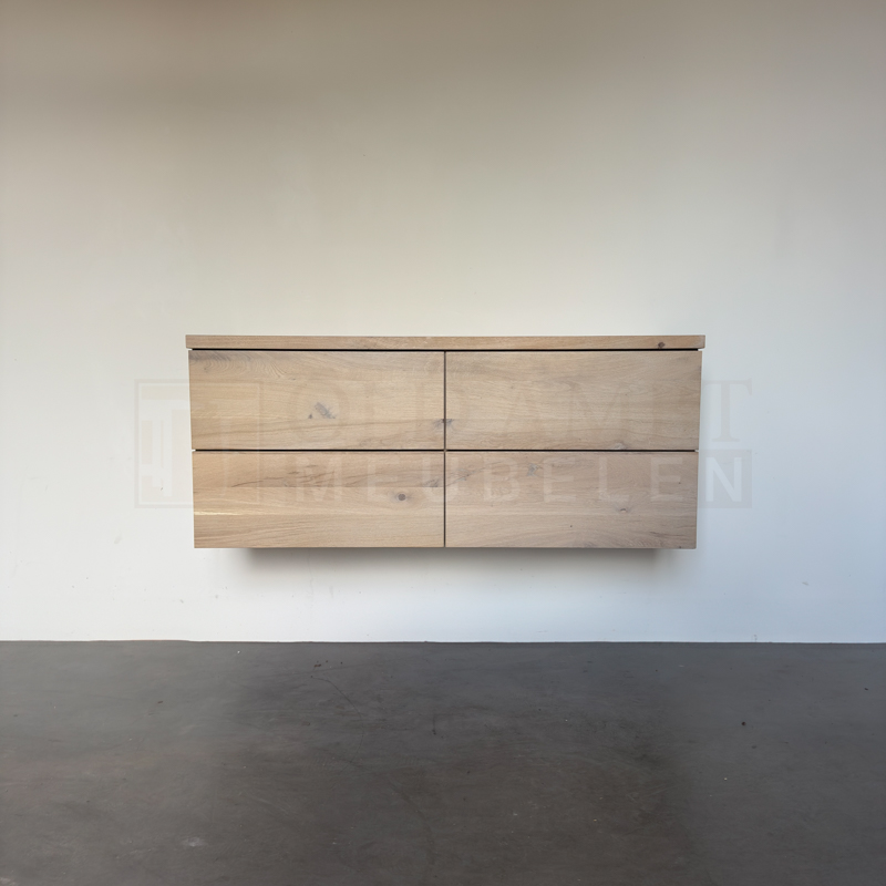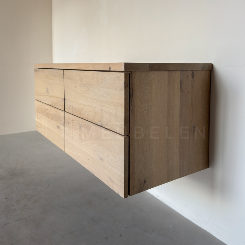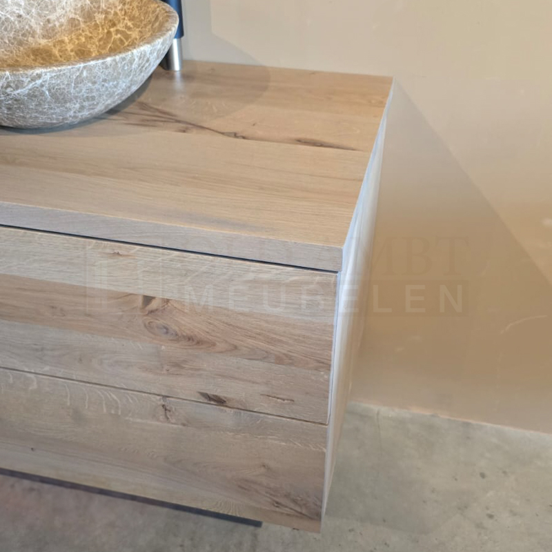 Badkamermeubel Zoe is gemaakt van eikenhout en kan worden behandeld in een door u gewenste kleur. Het meubel wordt afgelakt met een 2k lak (beschermlaag tegen vochtvlekken/kringen). Het meubel heeft 4 laden en zijn standaard voorzien van Push-to-Open ladegeleiders. U kunt ook kiezen voor de combinatie Push-to-Open en Soft-Close. Het blad steekt aan beide zijdes van het meubel 0,5/0,7 cm over i.v.m. eventuele werking van het meubel. Afmetingen lades: Dieptemaat ladebak 40cm x H 15cm.