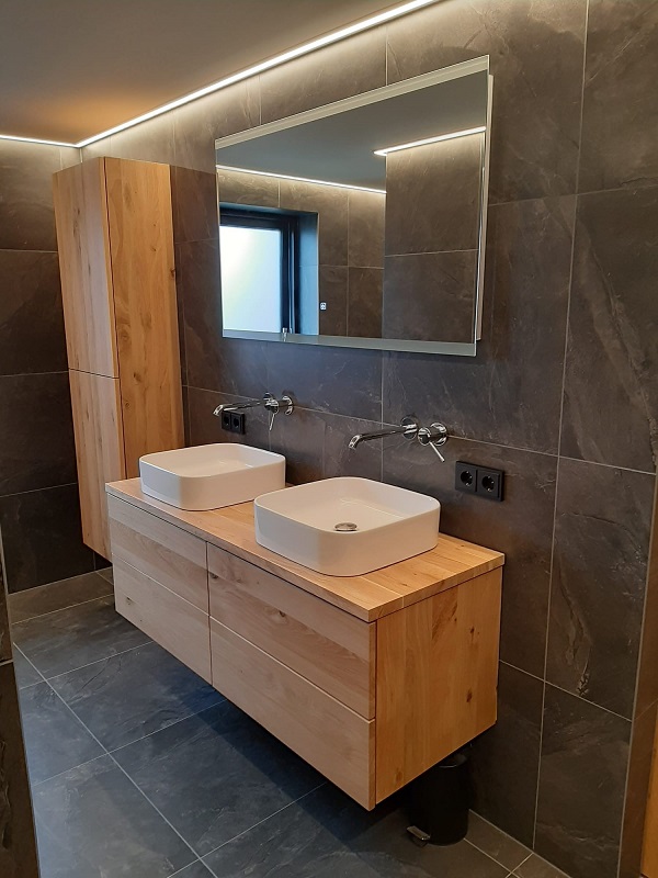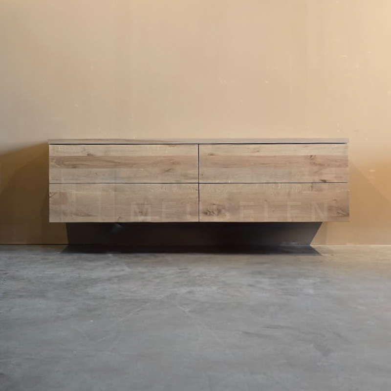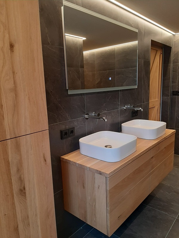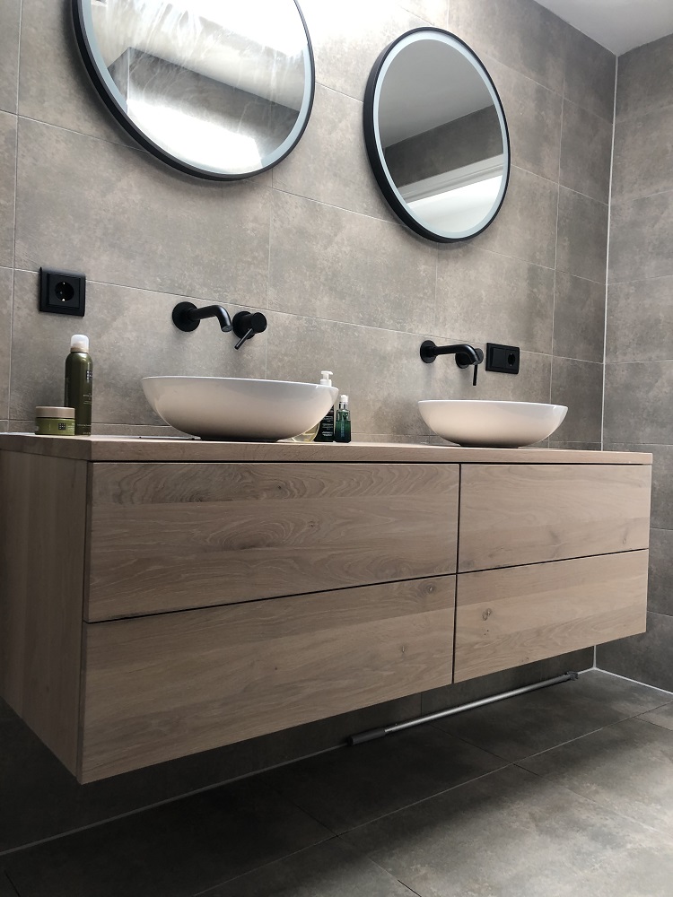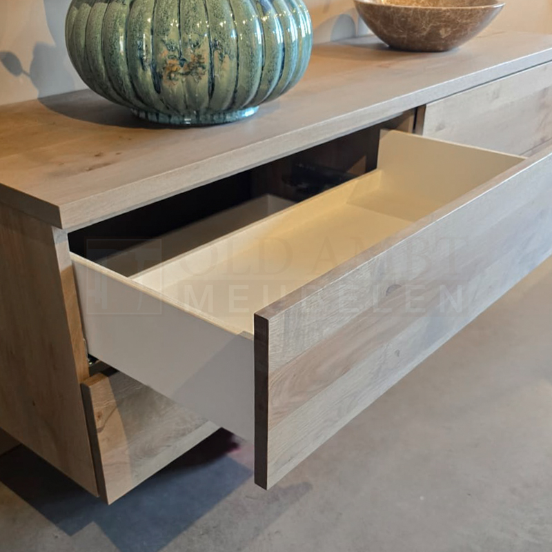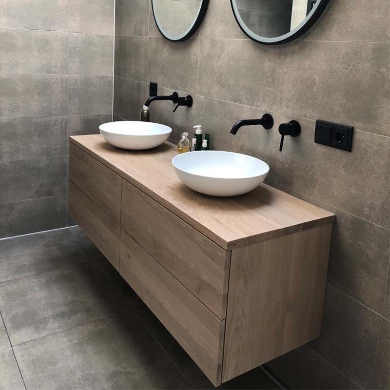 Badkamermeubel Zoe is gemaakt van eikenhout en kan worden behandeld in een door u gewenste kleur. Het meubel wordt afgelakt met een 2k lak (beschermlaag tegen vochtvlekken/kringen). Het meubel heeft 4 laden en zijn standaard voorzien van Push-to-Open ladegeleiders. U kunt ook kiezen voor de combinatie Push-to-Open en Soft-Close. Het blad steekt aan beide zijdes van het meubel 0,5/0,7 cm over i.v.m. eventuele werking van het meubel. Afmetingen lades: Dieptemaat ladebak 40cm x H 15cm.