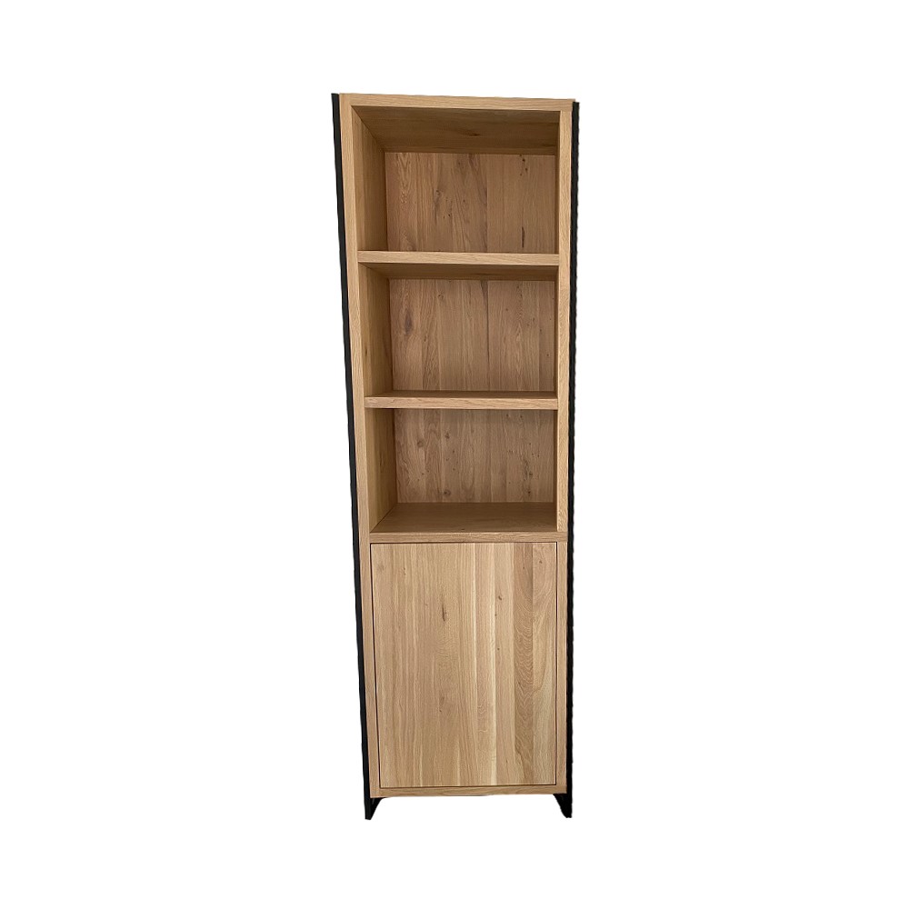 Kast Lize is gemaakt van eiken en behandeld in een kleur naar keuze. De kast heeft 3 open vakken en 1 deur die voorzien is van push to open systeem en achter de deur is een legplank gemaakt. De kast staat op een poot van 8cm hoog. De kast is gemaakt met een koker van 3 x 2 cm en kan in de kleuren zwart (RAL 9005), Blank of Wit (RAL 9010) gespoten worden. De kast op de foto is behandeld met een blanke 000 matte lak (beschermlaag tegen kringen en vlekken)