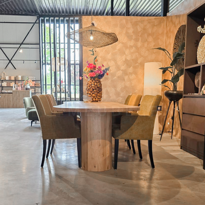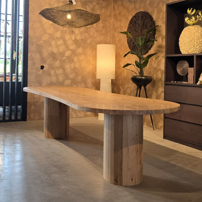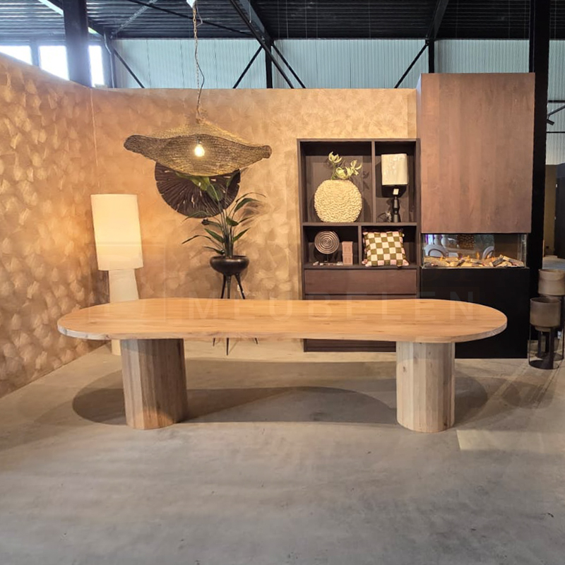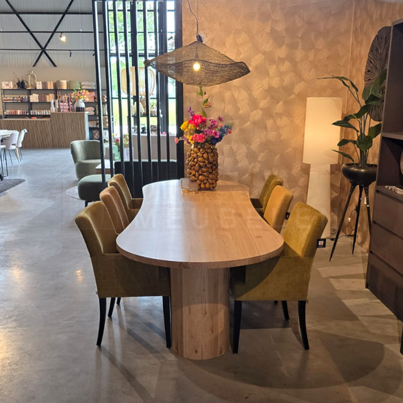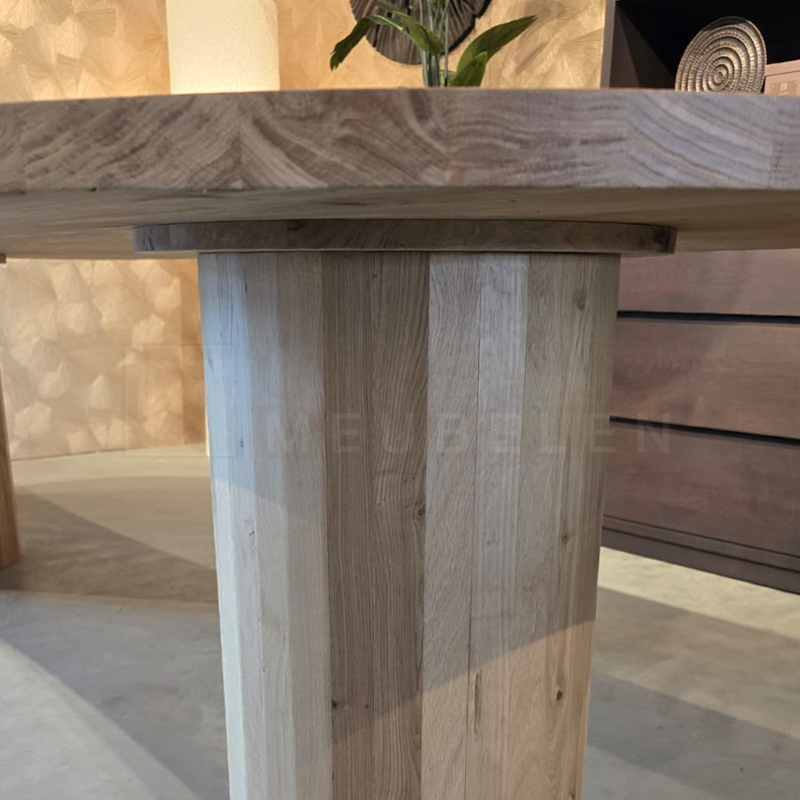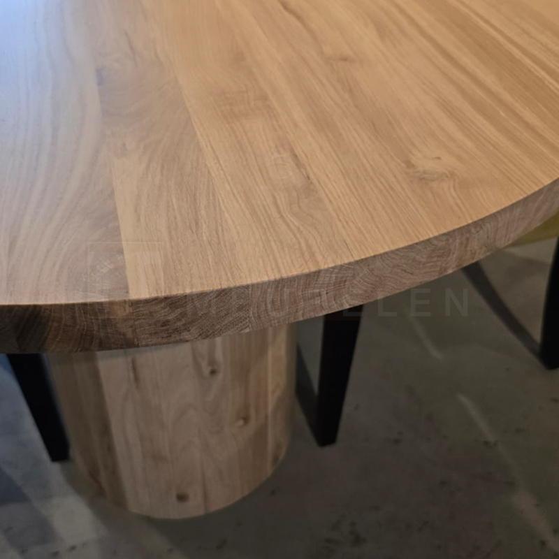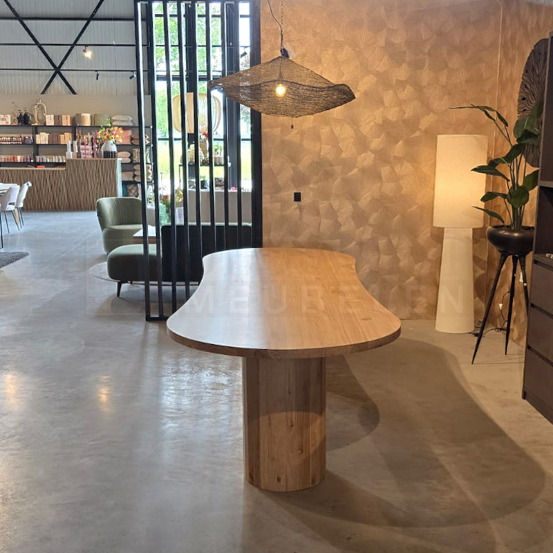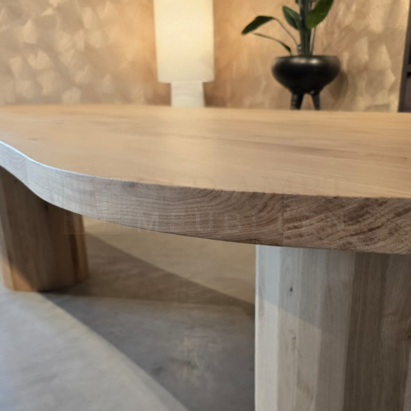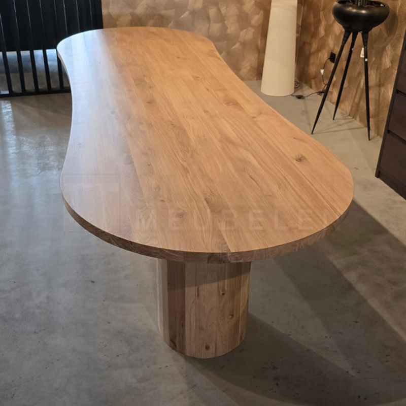 Het blad van de organische tafel Anke is gemaakt van 4 cm eiken en wordt behandeld in een door u gewenste kleur. De tafel op de foto is behandeld 3000 transparant en afgelakt met een matte blanke lak (beschermlaag tegen vochtvlekken/kringen). De tafel heeft 2 eiken houten poten en kan gespoten worden in de kleuren van de tafel.