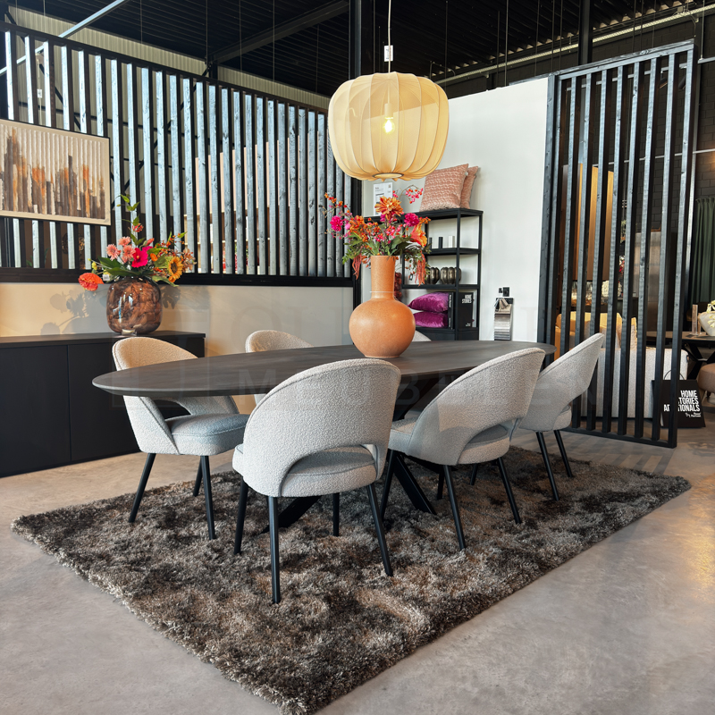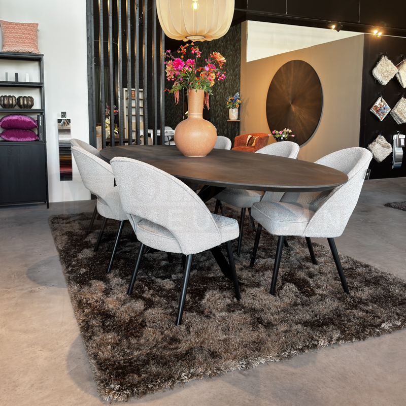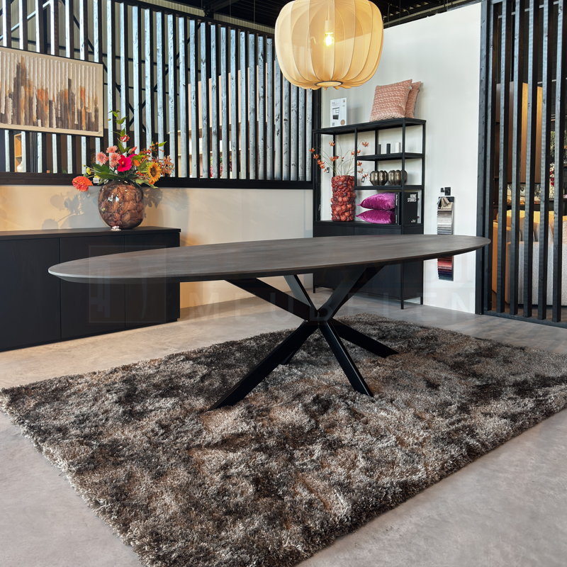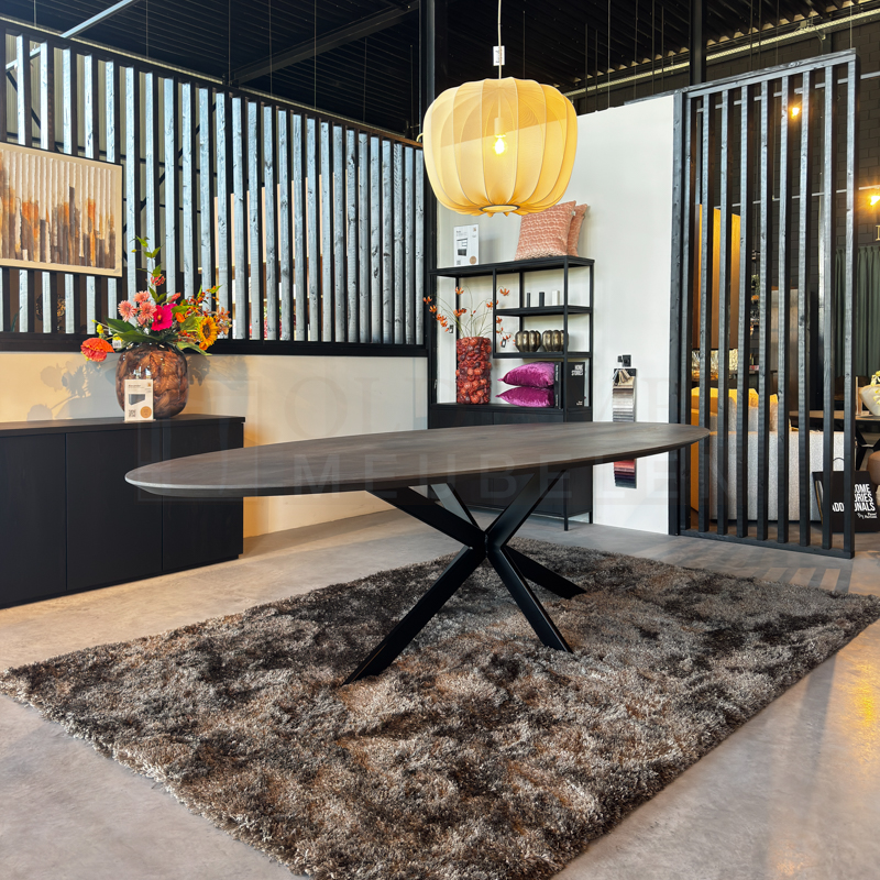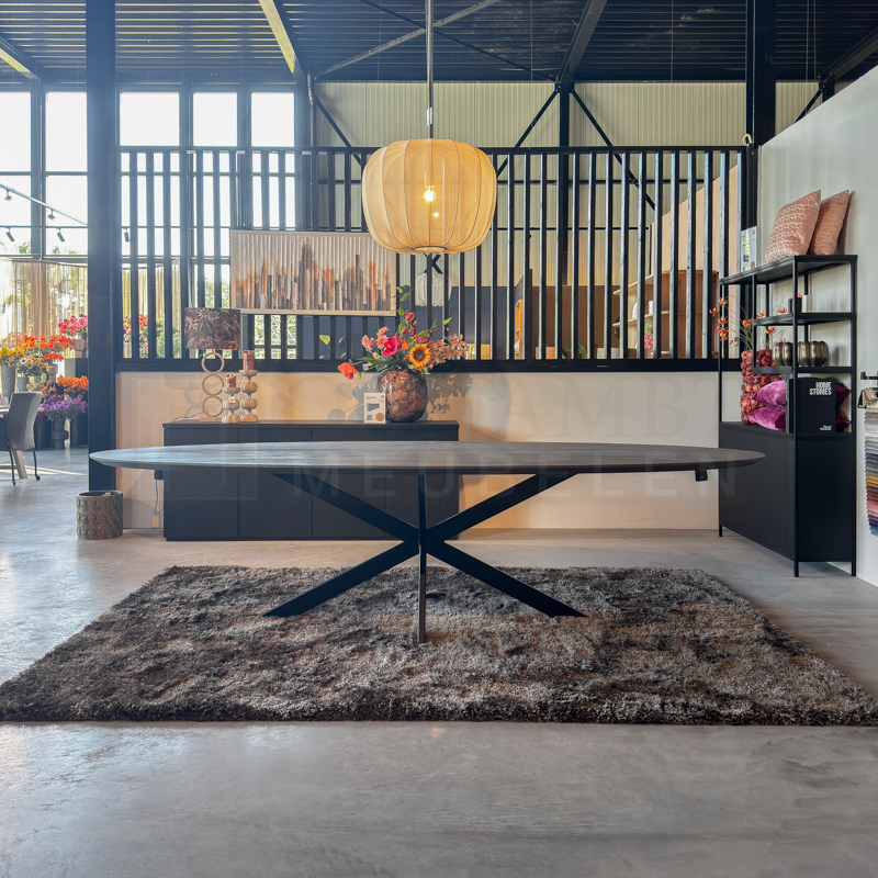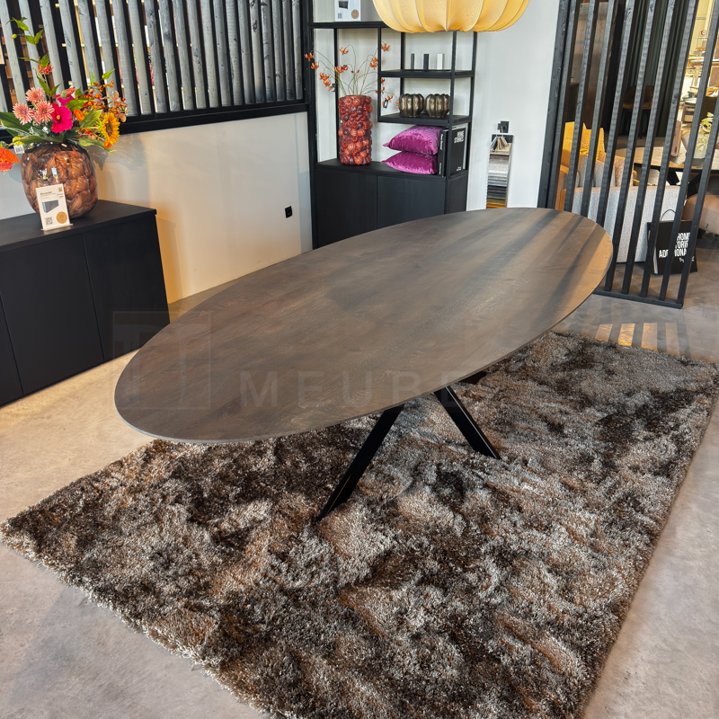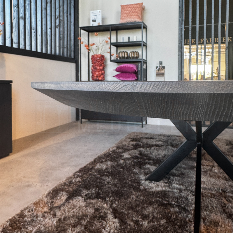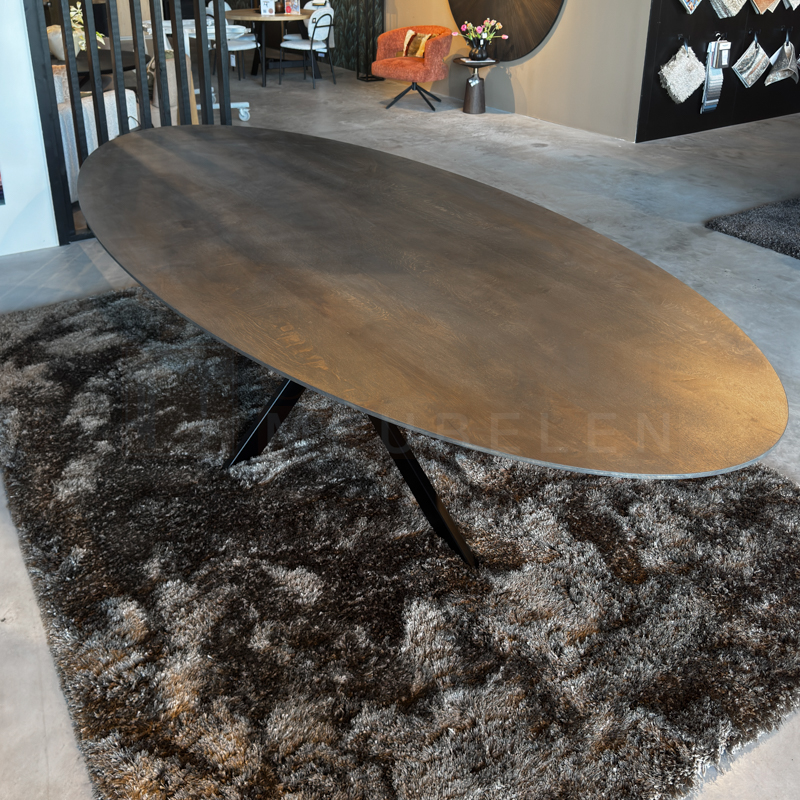 Het blad van de ovale tafel Frugo is gemaakt van 4 cm eiken, heeft een verjongde rand en wordt behandeld in een door u gewenste kleur. De tafel op de foto is behandeld 3180 Black en afgelakt met een matte blanke lak (beschermlaag tegen vochtvlekken/kringen). De tafel heeft een stalen smalle vlinderonderstel en kan gespoten worden in Wit (RAL 9010), Grijsbeige (RAL 1019), Parelgoud (RAL1036), Chocoladebruin (RAL 8017), Olijfgroen (RAL 7002), Parelmoergrijs (RAL 1035), Ombergrijs (RAL 7022), Zwart (RAL 9005).