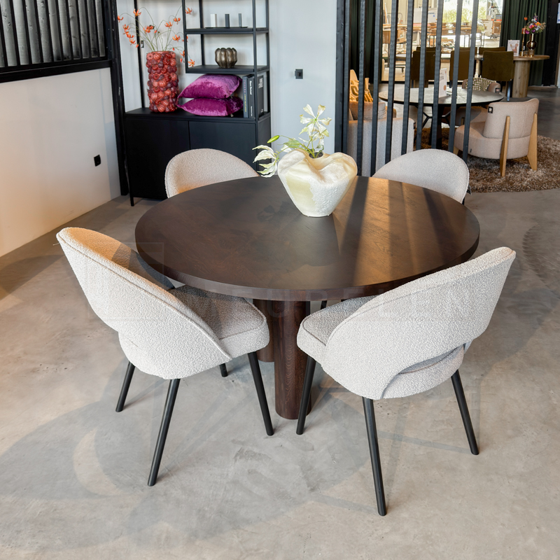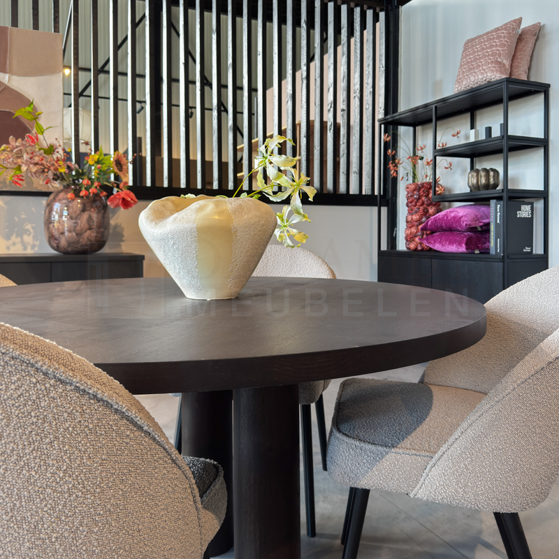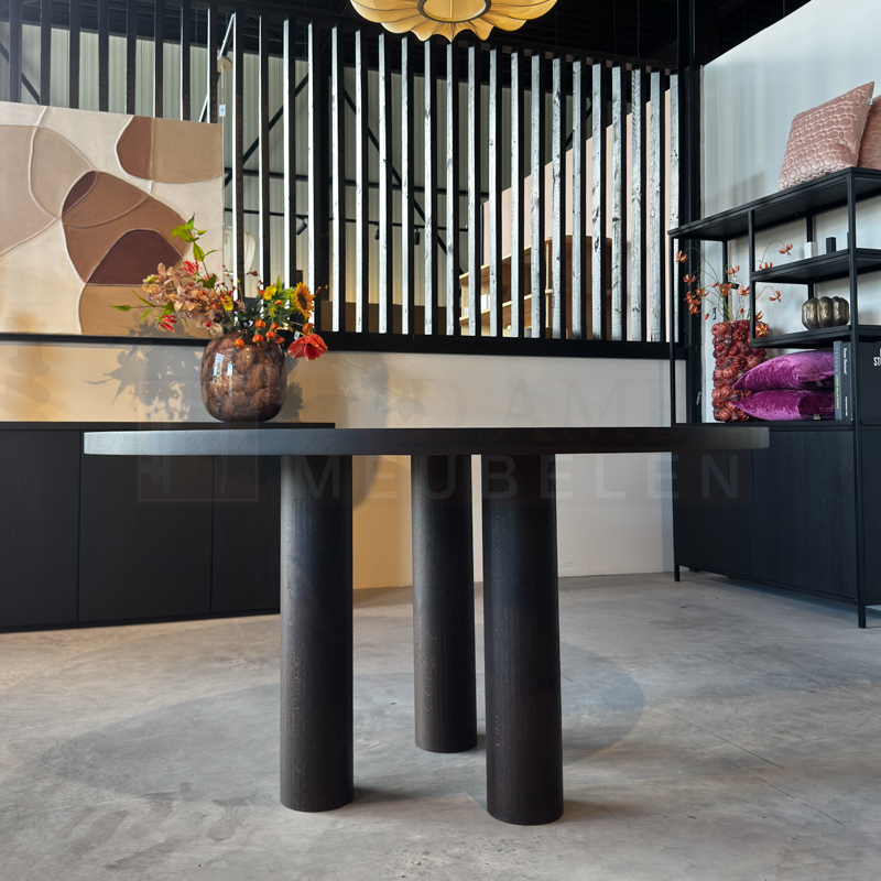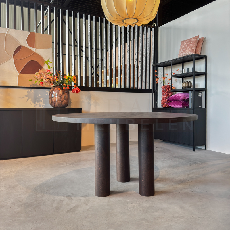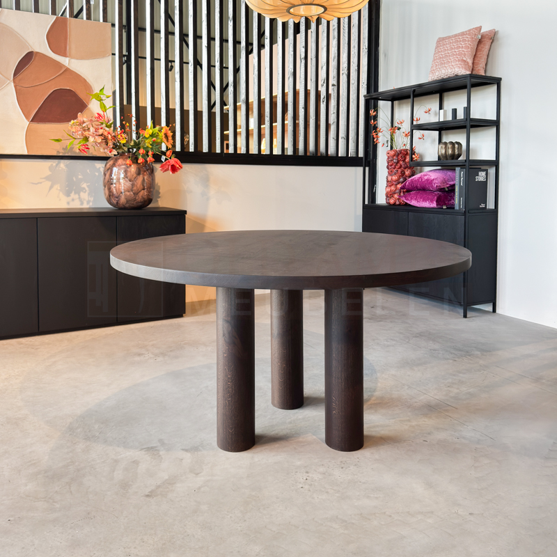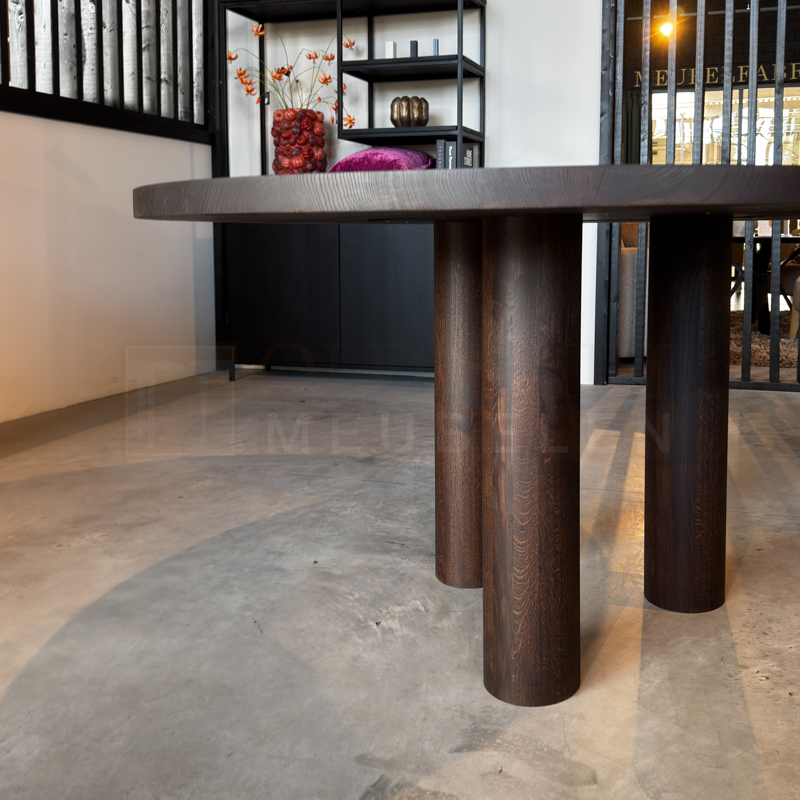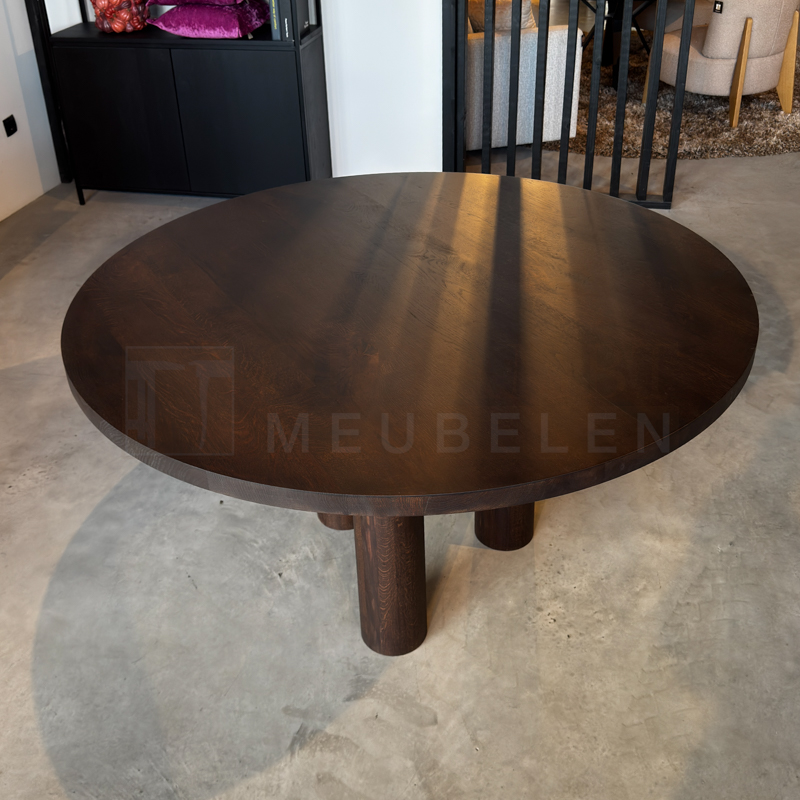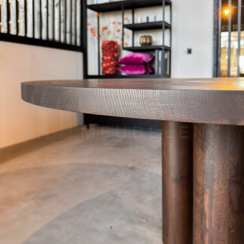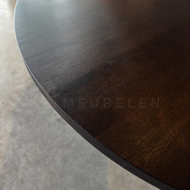 Het ronde blad van de Plen tafel is gemaakt van eikenhout 4 cm met en behandeld in een door u gewenste kleur. De tafel op de foto is behandeld met TINDA 431 bruin (kleur op aanvraag) en afgelakt met een 2K lak, wat direct een beschermlaag vormt tegen vochtvlekken en kringen. Het onderstel is gemaakt van eiken hout en is in gewenste kleur te bestellen.