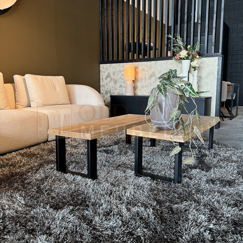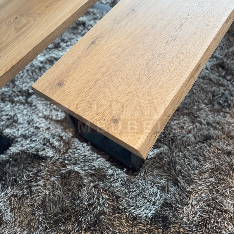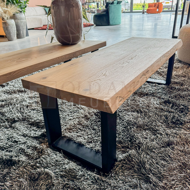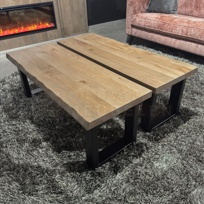 Het blad van salontafel Boom is gemaakt van 4 cm massief dik eikenhout boomstamblad en wordt behandeld in een door u gewenste kleur. De breedte van de bladen variëren i.v.m. het boomstameffect. De tafel op de foto is transparant behandeld (dit is een beschermlaag tegen vochtvlekken en kringen). De salontafel bestaat uit 2 delen. Het frame is gemaakt van een metalen 8 x 4 cm U-poot koker en kan gespoten worden in zwart, wit en blank.