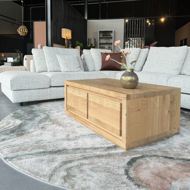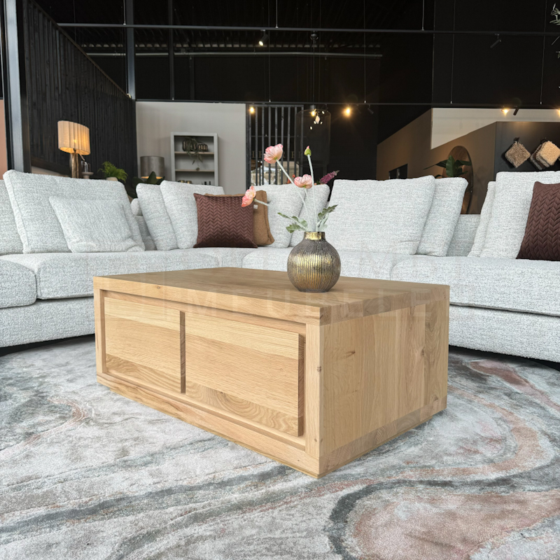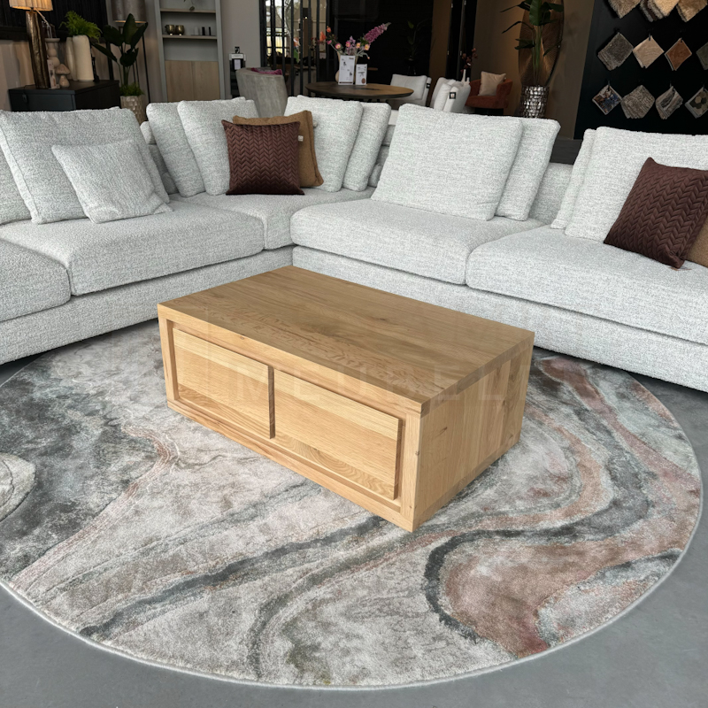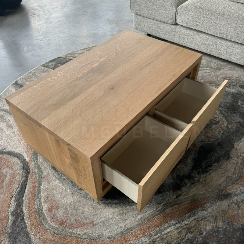 De salontafel Henry is gemaakt van 2 cm massief dik eikenhout en wordt behandeld in een door u gewenste kleur. De tafel op de foto is behandeld met 3000 Transparant. (dit is een beschermlaag tegen vochtvlekken en kringen). De salontafel is voorzien van 4 lades.
