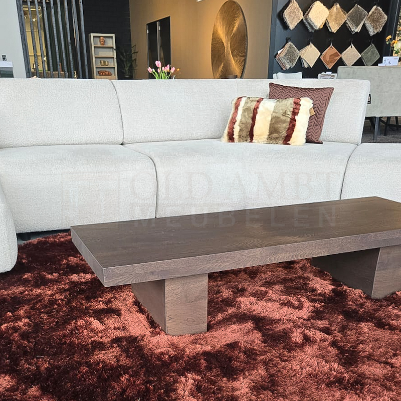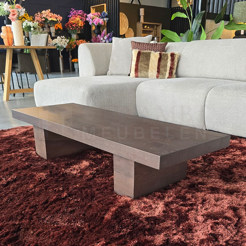 Het blad van de salontafel is gemaakt van 6 cm (3 + 3 cm opgedikt) dik eikenhout en worden behandeld in een door u gewenste kleur. Het blad op de foto is in 431 bruin behandeld, deze kleur kan op aanvraag. (dit is een beschermlaag tegen vochtvlekken en kringen). De poten zijn 15 cm breed, 40 cm lang en 27 cm hoog (salontafel zoals afgebeeld)