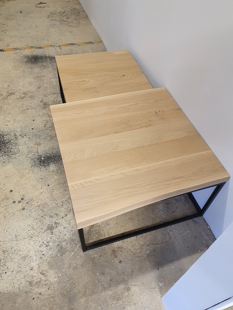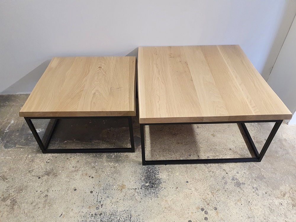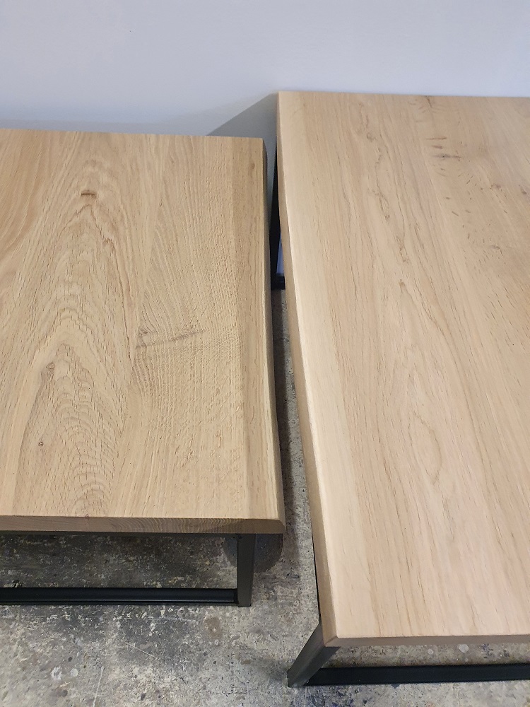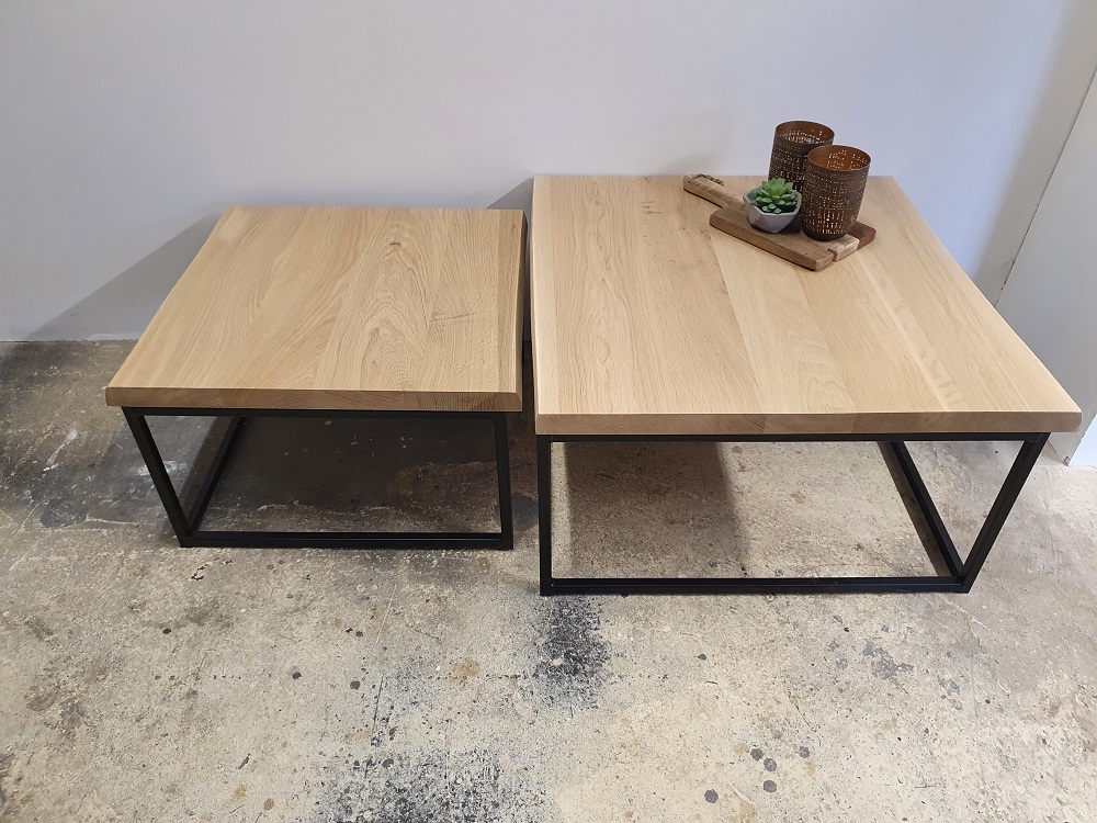De bladen van de salontafel set Loïs zijn gemaakt van 4 cm massief dik eikenhout boomstamblad en wordt behandeld in een door u gewenste kleur. De breedte van de bladen variëren i.v.m. het boomstameffect. De tafel op de foto is behandeld met 3111 wit (dit is een beschermlaag tegen vochtvlekken en kringen). De salontafel bestaat uit 2 delen. Het frame is gemaakt van een metalen 3 x 3 cm koker en kan gespoten worden in zwart, wit en blank. Afmetingen: 75 x 75 x 40 cm/60 x 60 x 32 cm.