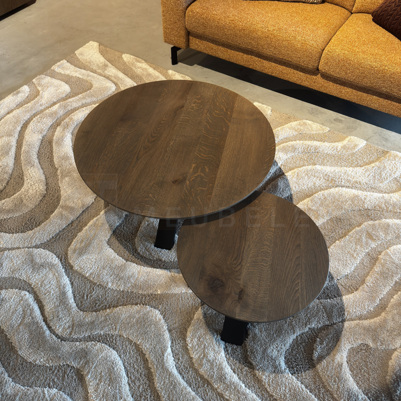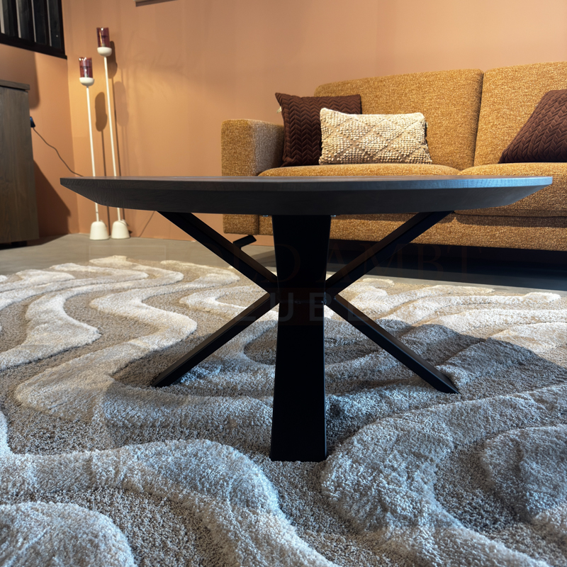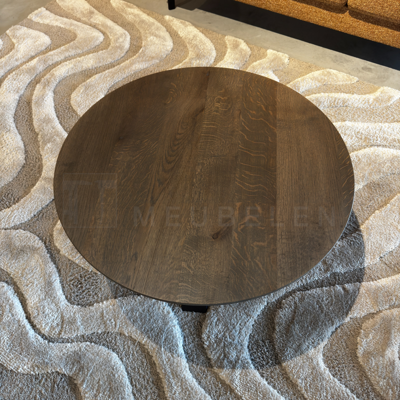 Het blad van de salontafel is gemaakt van 4 cm eiken met verjongde rand en wordt behandeld in een door u gewenste kleur. De tafel op de foto is behandeld in 4240 Sepia (dit is een beschermlaag tegen vochtvlekken en kringen). Het metaal kan gespoten worden in de kleuren Wit (RAL 9010), Grijsbeige (RAL 1019), Parelgoud (RAL1036), Chocoladebruin (RAL 8017), Olijfgroen (RAL 7002), Parelmoergrijs (RAL 1035), Ombergrijs (RAL 7022) en Zwart (RAL 9005).