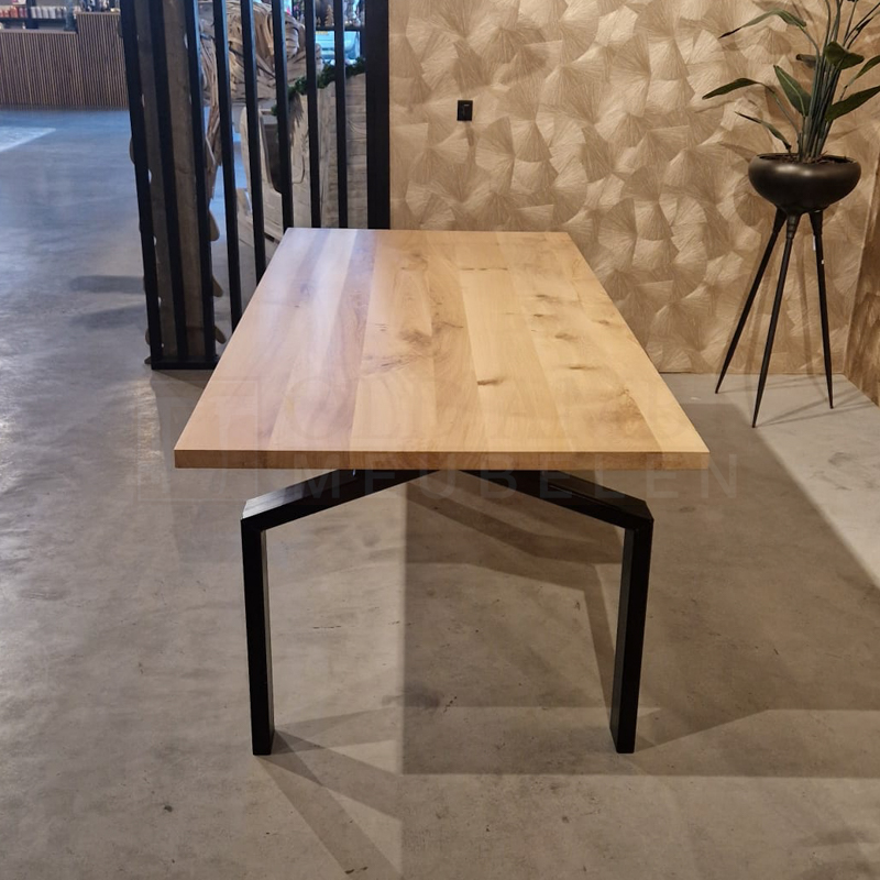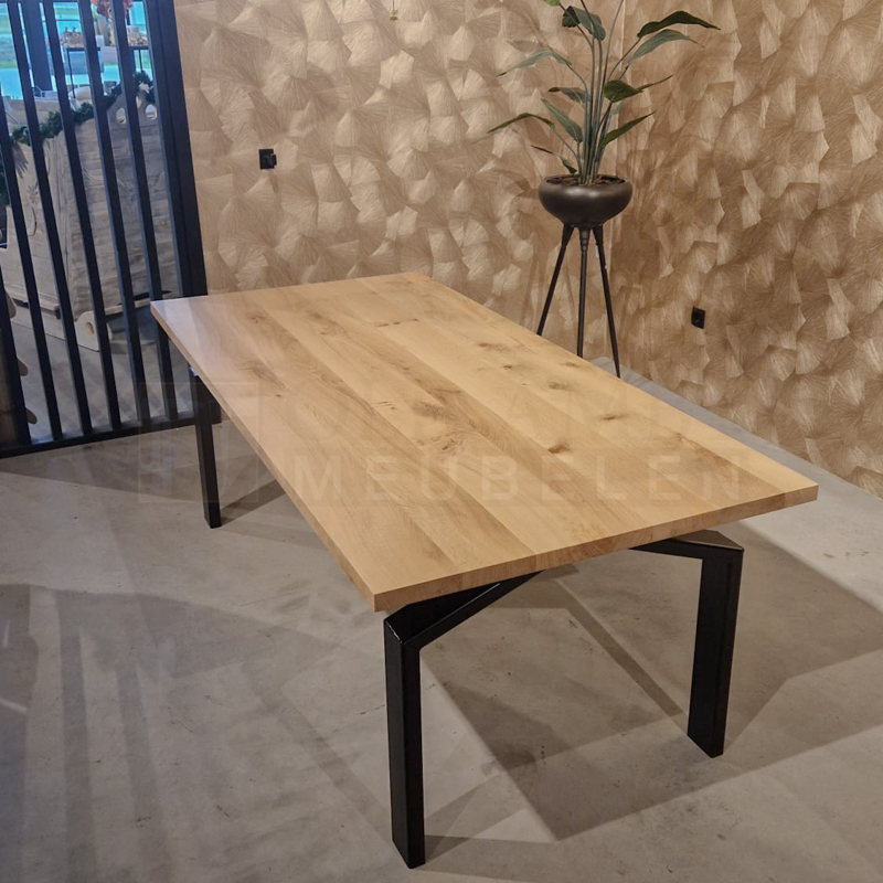 Het blad van tafel Clyde is gemaakt van massief 4 cm eiken en behandeld in een door u gewenste kleur. De tafel op de foto is behandeld met een blanke matte lak (beschermlaag tegen vochtvlekken/kringen). Het onderstel is gemaakt van een metalen 10 x 4 cm koker en kan gespoten worden in Wit (RAL 9010), Grijsbeige (RAL 1019), Parelgoud (RAL1036), Chocoladebruin (RAL 8017), Olijfgroen (RAL 7002), Parelmoergrijs (RAL 1035), Ombergrijs (RAL 7022), Zwart (RAL 9005).
