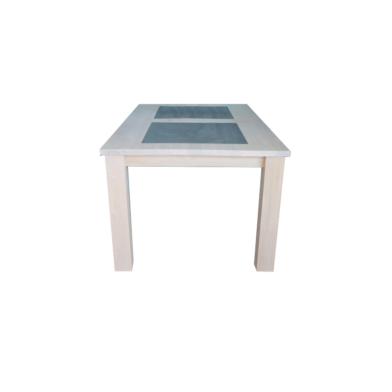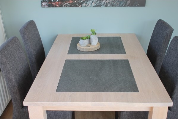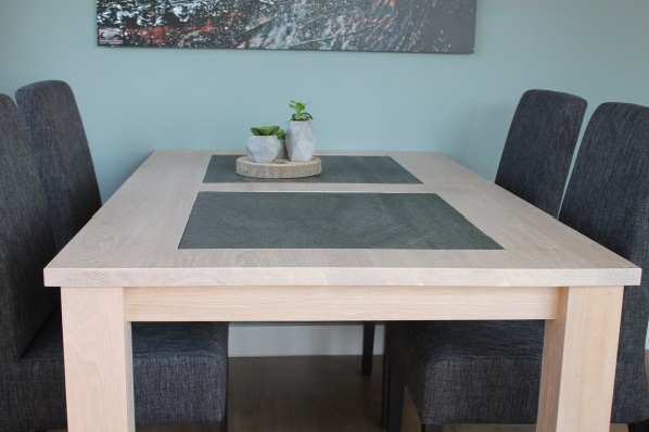 Eiken tafel blad dat wordt behandeld in een door u gewenste kleur. De tafel op de foto is behandeld met een witte meubelolie 3111 en afgelakt met een matte blanke lak. Midden in het blad liggen keramische stenen van 60 x 60cm. Het eiken onderstel heeft 10 x 10cm eiken poten. Bent u nog niet helemaal uit over de kleur?
