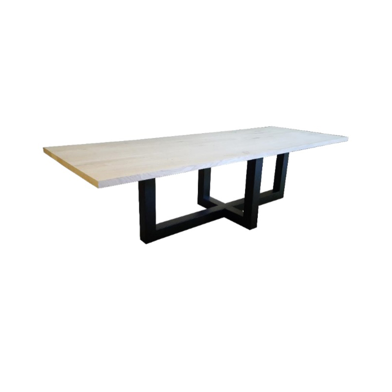 Het blad is gemaakt van massief 4 cm eiken en behandeld in een door u gewenste kleur. De tafel op de foto is behandeld met een blanke matte lak (beschermlaag tegen vochtvlekken/kringen). Het onderstel is gemaakt van een metalen kruisframe 10 x 10cm koker en kan gespoten worden in Wit (RAL 9010), Grijsbeige (RAL 1019), Parelgoud (RAL1036), Chocoladebruin (RAL 8017), Olijfgroen (RAL 7002), Parelmoergrijs (RAL 1035), Ombergrijs (RAL 7022), Zwart (RAL 9005)