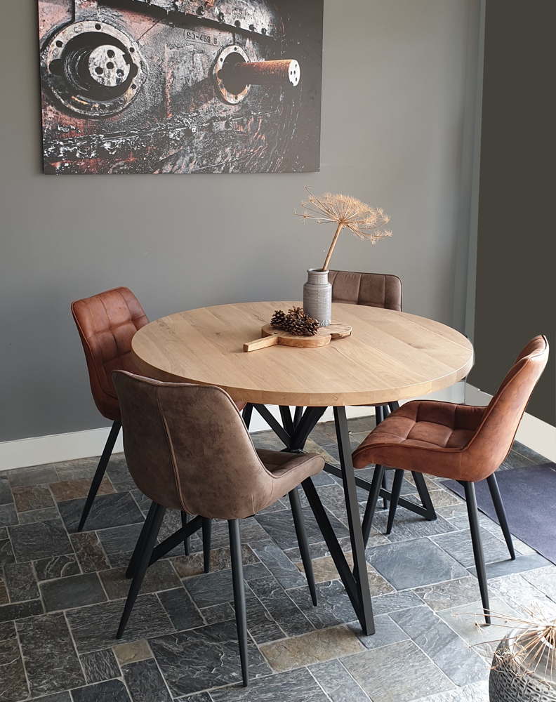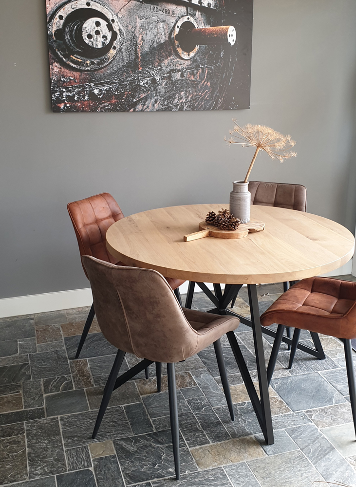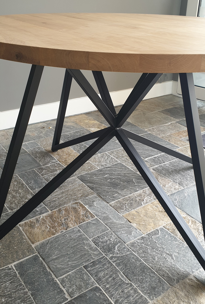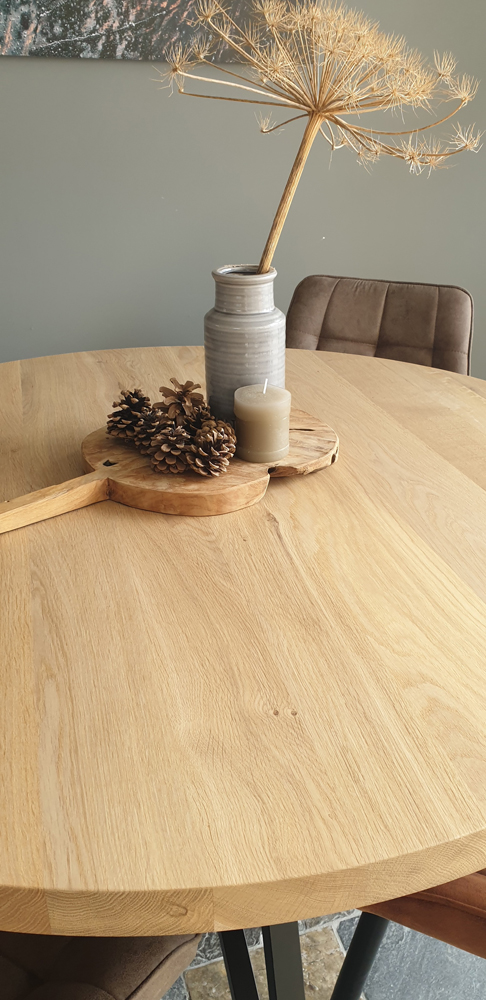 Het ronde blad is gemaakt van eikenhout en behandeld in een door u gewenste kleur. De tafel op de foto is behandeld met een 2K lak, wat direct een beschermlaag vormt tegen vochtvlekken en kringen. Het onderstel is gemaakt van een metalen 3 x 3cm koker en kan gespoten worden in Wit (RAL 9010), Grijsbeige (RAL 1019), Parelgoud (RAL1036), Chocoladebruin (RAL 8017), Olijfgroen (RAL 7002), Parelmoergrijs (RAL 1035), Ombergrijs (RAL 7022), Zwart (RAL 9005).