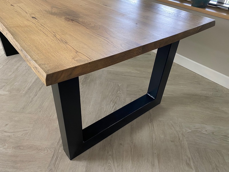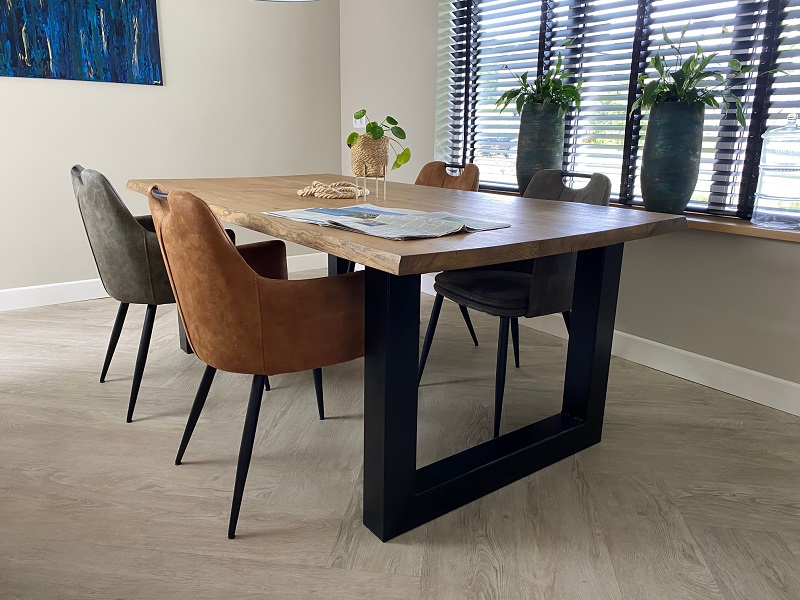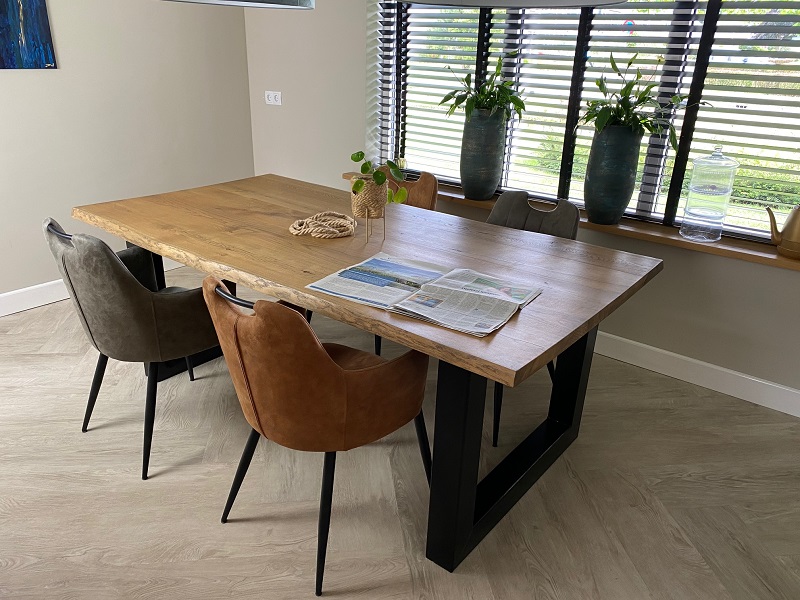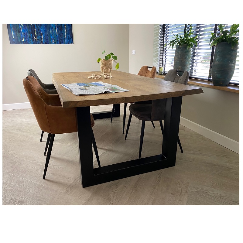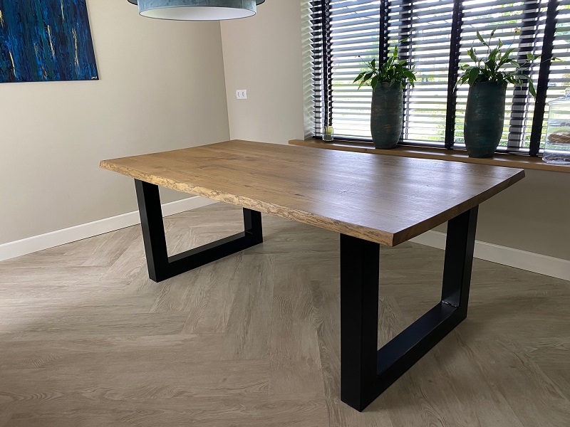 Tafel Guus met boomstamblad & industriële poten. Het blad is gemaakt van 4 cm eiken en wordt behandeld in een door u gewenste kleur. Het blad is niet precies 106 cm breed, dit variëert i.v.m. het boomstameffect. De tafel op de foto is behandeld met meubelolie zand 4220 en is afgewerkt met een matte blanke lak (beschermlaag tegen vochtvlekken/kringen). De metalen U-poten 10 x 10cm kan gespoten worden in Wit (RAL 9010), Grijsbeige (RAL 1019), Parelgoud (RAL1036), Chocoladebruin (RAL 8017), Olijfgroen (RAL 7002), Parelmoergrijs (RAL 1035), Ombergrijs (RAL 7022), Zwart (RAL 9005).