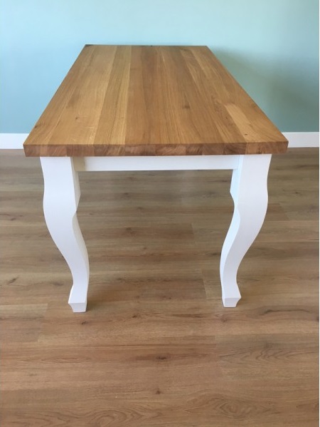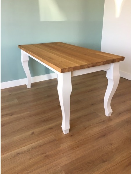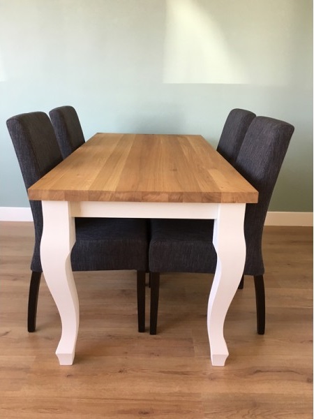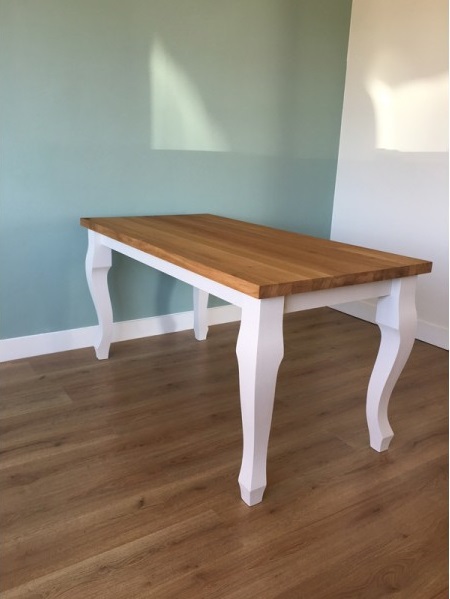 Het blad is gemaakt van eiken en wordt behandeld in een door u gewenste kleur. De tafel op de foto is behandeld met een matte blanke lak (beschermlaag tegen vochtvlekken/kringen). Het onderstel is gemaakt met een landelijke queen poot en is wit (RAL 9001) of zwart (RAL 9005) dekkend geverfd.