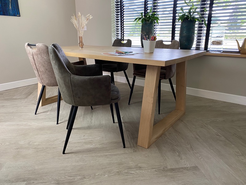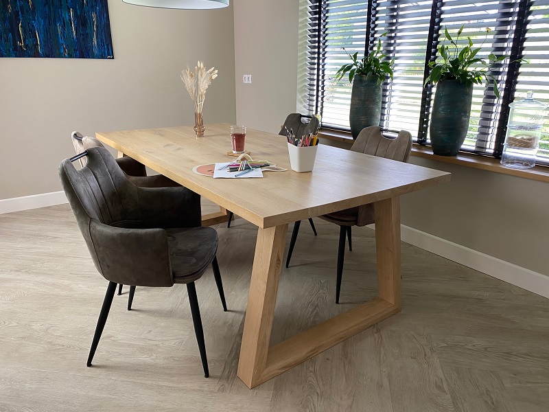 Het blad van tafel Marco is gemaakt van 4 cm eiken en wordt behandeld in een door u gewenste kleur. De tafel op de foto is behandeld 000 blank en afgelakt met een matte blanke lak (beschermlaag tegen vochtvlekken/kringen). Het onderstel is gemaakt van hout 10 x 6 cm.