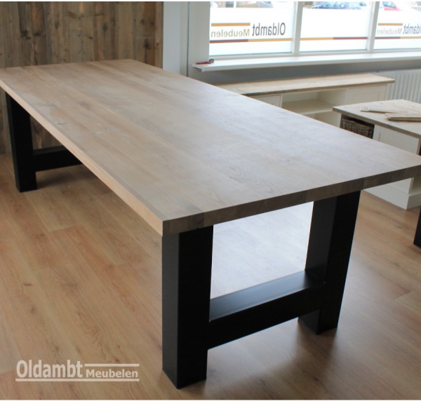 Het blad is gemaakt van eiken en wordt behandeld in een door u gewenste kleur. De tafel op de foto is met een witte meubelolie en afgelakt met een blanke matte lak (bescherming tegen vochtvlekken / kringen ). Het frame is gemaakt van een stalen H-poot en kan gespoten worden in Wit (RAL 9010), Grijsbeige (RAL 1019), Parelgoud (RAL1036), Chocoladebruin (RAL 8017), Olijfgroen (RAL 7002), Parelmoergrijs (RAL 1035), Ombergrijs (RAL 7022), Zwart (RAL 9005).