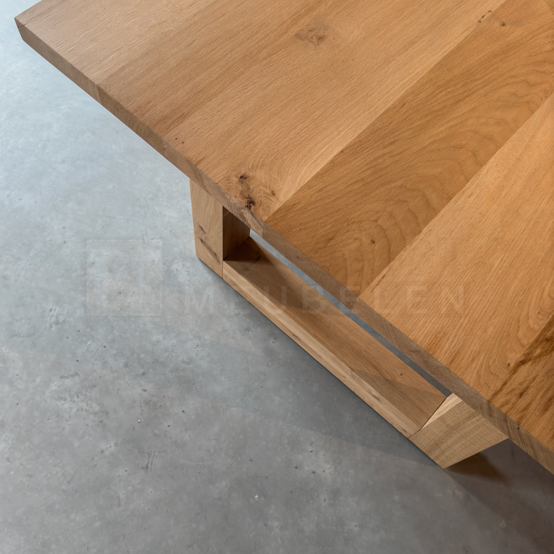 Het blad is gemaakt van 4 cm eiken en wordt behandeld in een door u gewenste kleur. De tafel op de foto is behandeld 3000 transparant en afgelakt met een matte blanke lak (beschermlaag tegen vochtvlekken/kringen). Het onderstel is gemaakt van hout 10 x 10 cm.