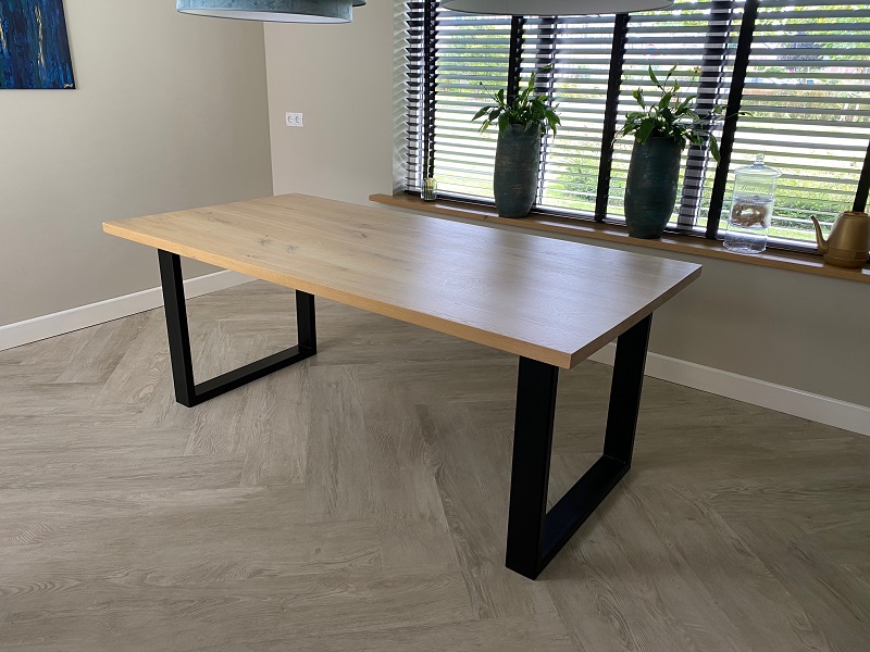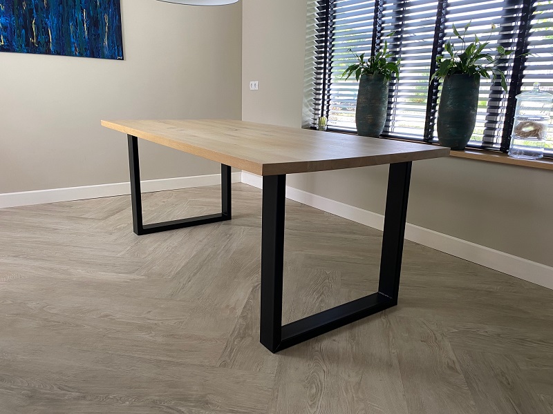 Het blad van tafel Peter is gemaakt van 4 cm eiken en wordt behandeld in een door u gewenste kleur. De tafel op de foto is behandeld 000 blank en afgelakt met een matte blanke lak (beschermlaag tegen vochtvlekken/kringen). De tafel heeft een stalen onderstel van 10 x 4 cm en kan gespoten worden in Wit (RAL 9010), Grijsbeige (RAL 1019), Parelgoud (RAL1036), Chocoladebruin (RAL 8017), Olijfgroen (RAL 7002), Parelmoergrijs (RAL 1035), Ombergrijs (RAL 7022), Zwart (RAL 9005).
