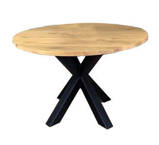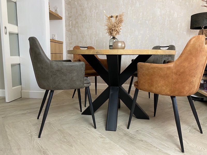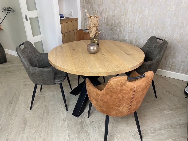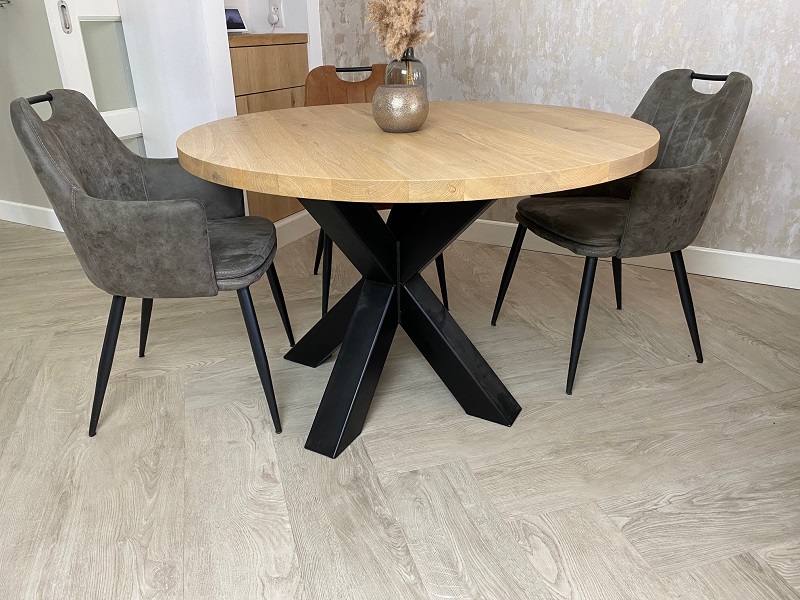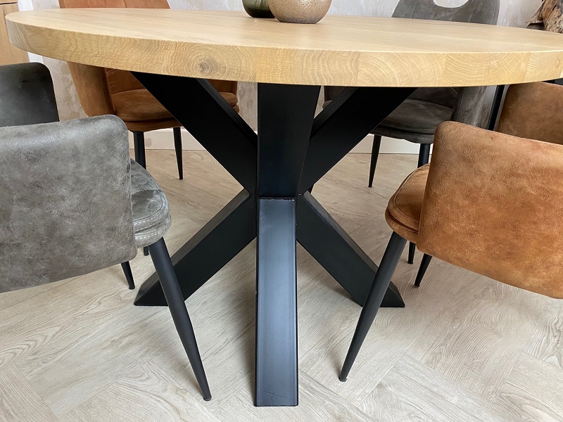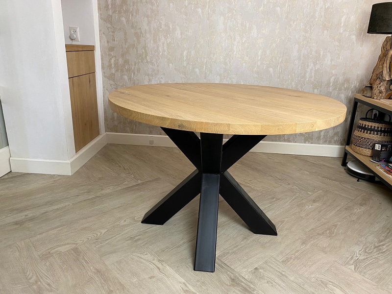 Het ronde blad is gemaakt van eikenhout en wordt behandeld in een door u gewenst kleur. De tafel op de foto is behandeld met meubelolie 000 blank, wat direct een beschermlaag vormt tegen vochtvlekken en kringen. Het 3D-onderstel is gemaakt van een metalen 8x8cm koker en kan gespoten worden in Wit (RAL 9010), Grijsbeige (RAL 1019), Parelgoud (RAL1036), Chocoladebruin (RAL 8017), Olijfgroen (RAL 7002), Parelmoergrijs (RAL 1035), Ombergrijs (RAL 7022), Zwart (RAL 9005).
