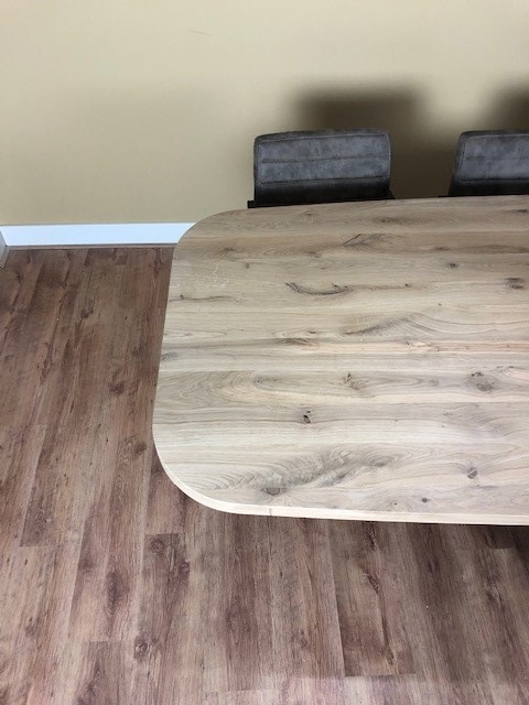 Het blad is gemaakt van eiken en word aan beide zijdes afgerond en wordt behandeld in een door u gewenste kleur. Het blad op de foto is behandeld met een witte meubelolie 3111 en afgelakt met een blanke matte lak (beschermlaag tegen vochtvlekken/kringen). Het onderstel is gemaakt van een stalen 10x10cm matrix poot en kan gespoten worden in Wit (RAL 9010), Grijsbeige (RAL 1019), Parelgoud (RAL1036), Chocoladebruin (RAL 8017), Olijfgroen (RAL 7002), Parelmoergrijs (RAL 1035), Ombergrijs (RAL 7022), Zwart (RAL 9005).