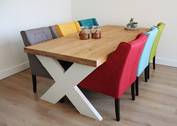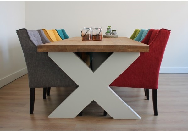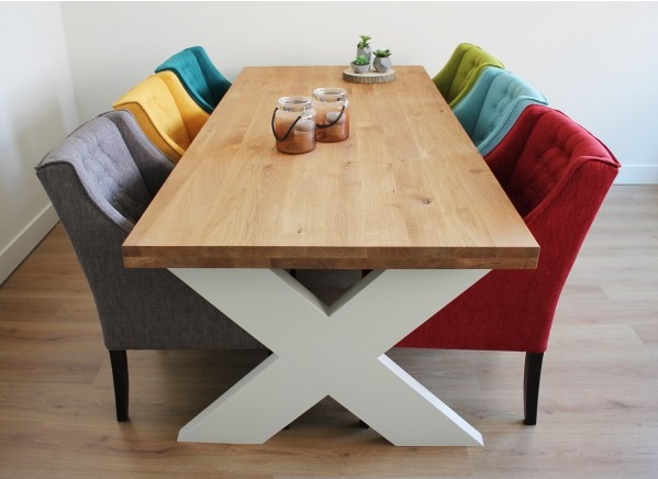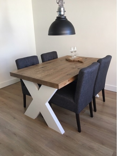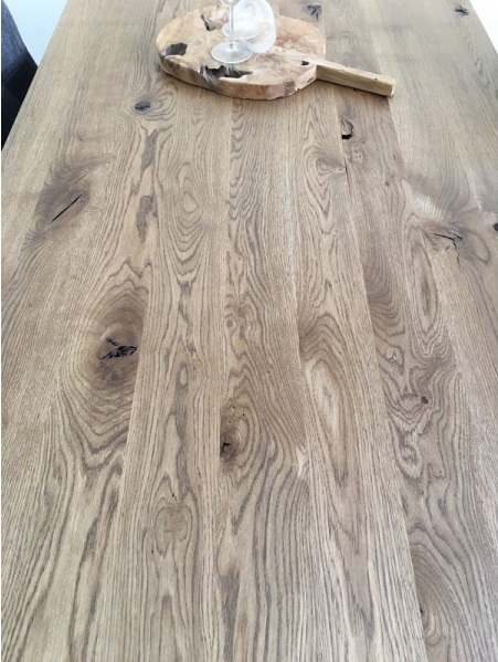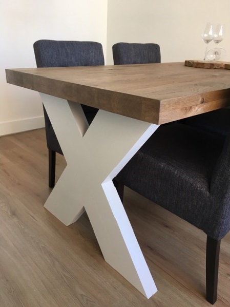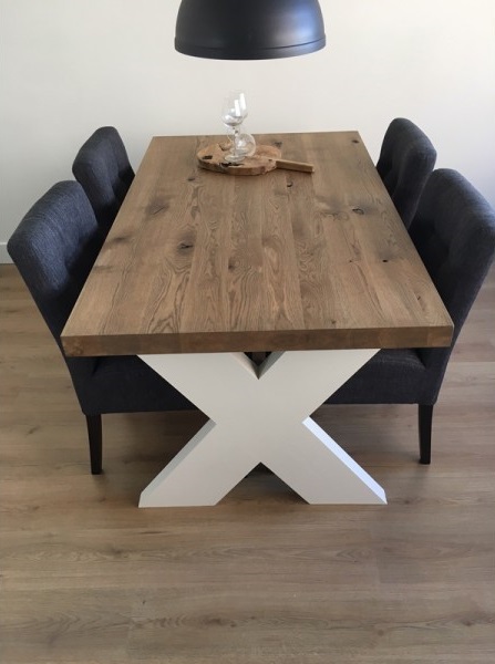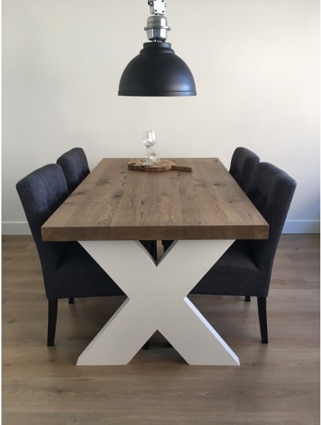 Het blad van eiken Tafel Simone is gemaakt van eiken en behandeld in een door u gewenste kleur. De tafel op de foto is afgelakt met een blanke matte lak (beschermlaag tegen vochtvlekken/kringen. Het blad is opgedikt 3+3cm. Het onderstel is gemaakt van nieuw hout en is 19,5cm breed en 6cm dik en word wit (RAL9001) of zwart (RAL9005) dekkend geverfd.
