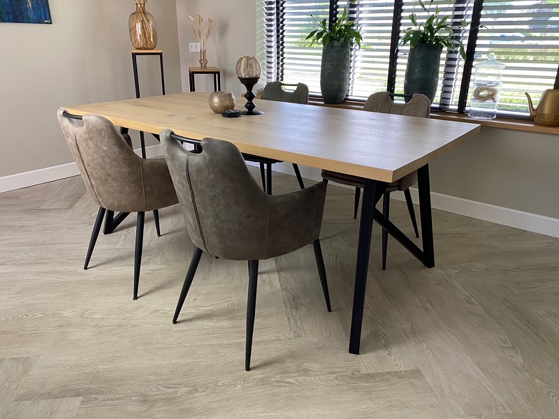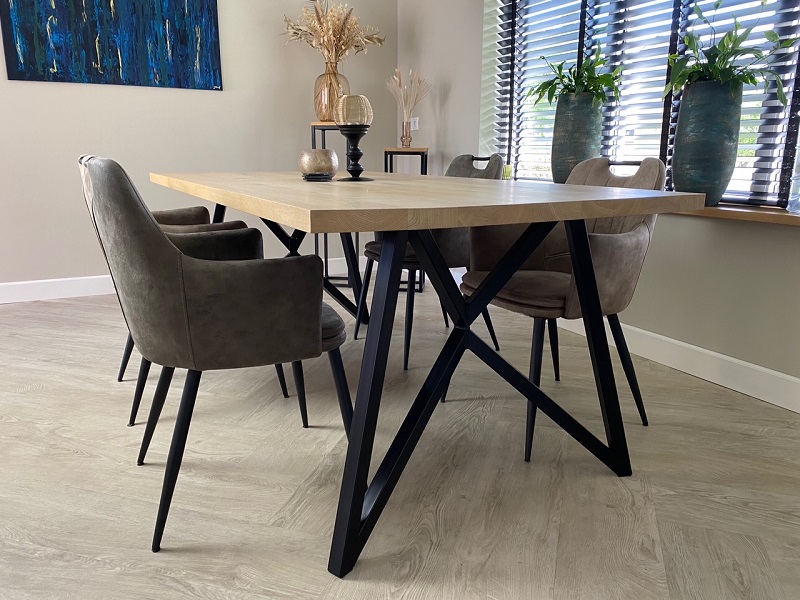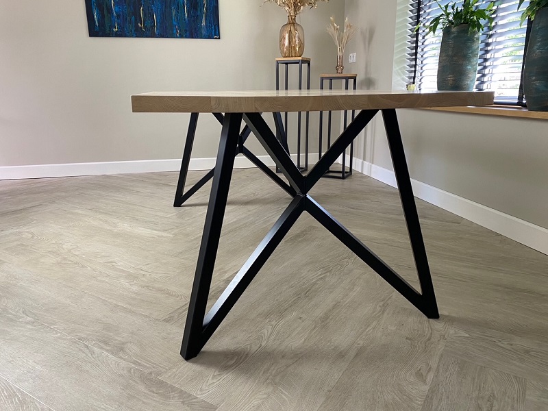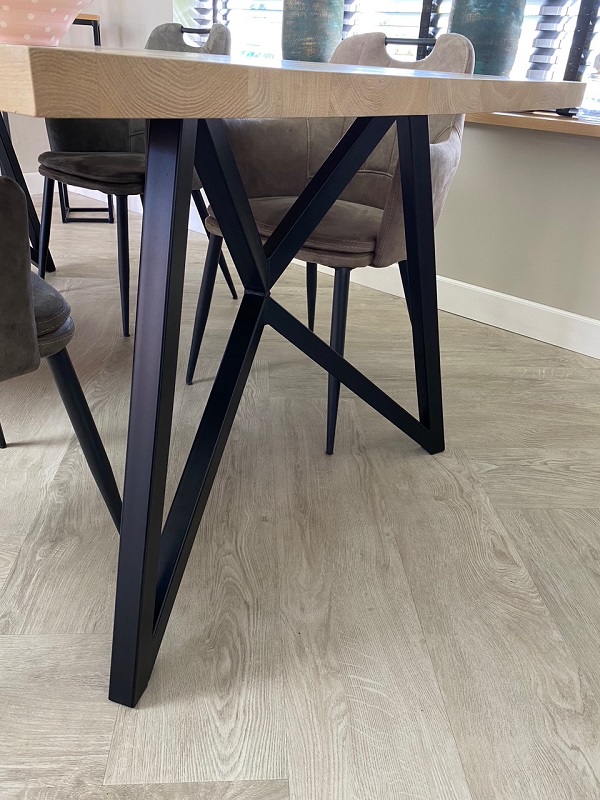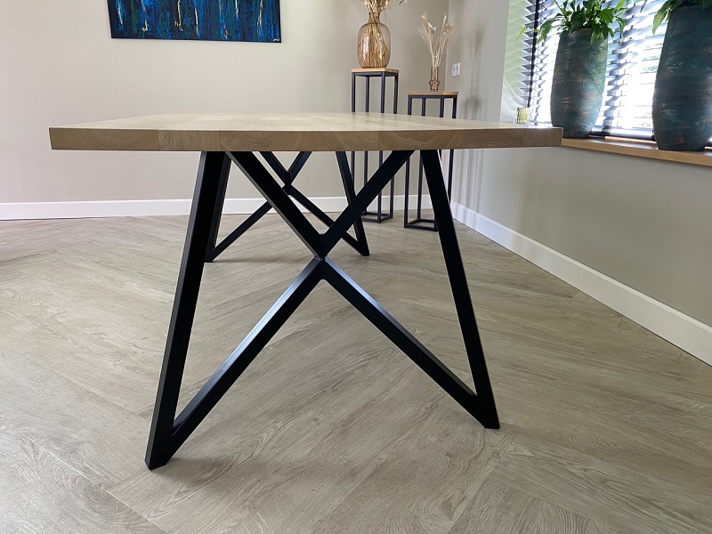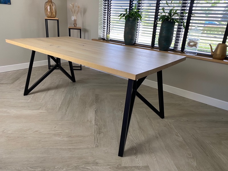 Het blad is gemaakt van eikenhout en wordt behandeld in een door u gewenste kleur. De tafel op de foto is behandeld met 000 blank en afgelakt met een 2K lak (bescherming tegen vochtvlekken/kringen). Het onderstel is gemaakt van een metalen 4x4cm koker en kan gespoten worden in Wit (RAL 9010), Grijsbeige (RAL 1019), Parelgoud (RAL1036), Chocoladebruin (RAL 8017), Olijfgroen (RAL 7002), Parelmoergrijs (RAL 1035), Ombergrijs (RAL 7022), Zwart (RAL 9005).