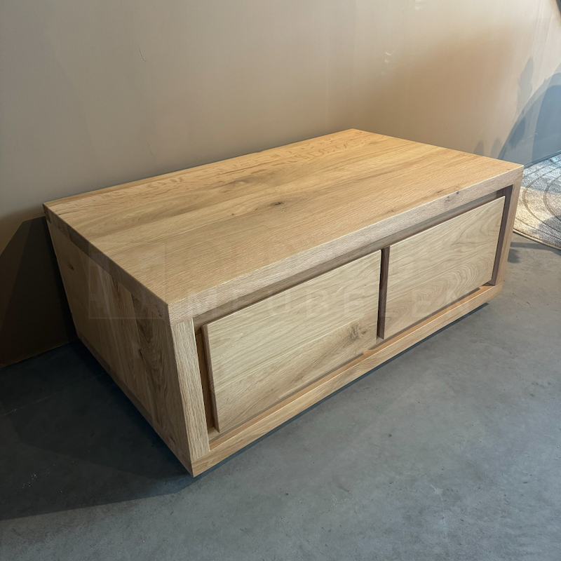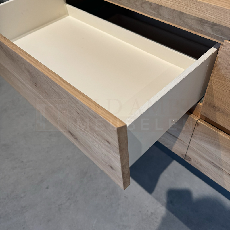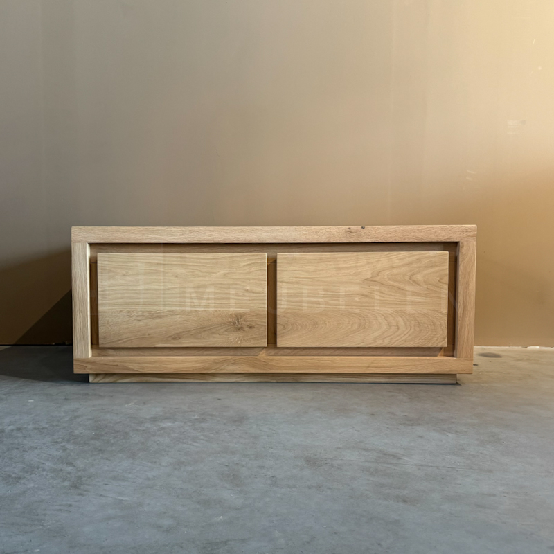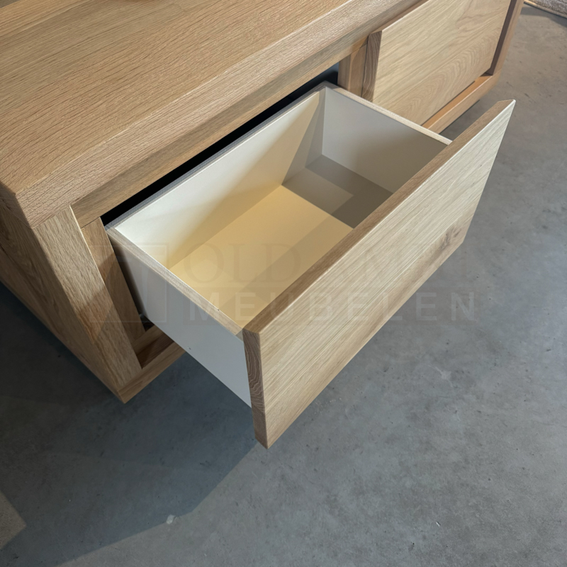 TV meubel Daan is gemaakt van eikenhout en behandeld in een door u gewenste kleur. Het TV meubel op de foto is behandeld met 3000 transparant en afgelakt met een 2k lak(beschermlaag tegen vochtvlekken/kringen). Het meubel is standaard voorzien van 2 lades die te openen zijn door een afgeschuinde ladefront. Bij dit meubel worden er niet standaard uitsparingen gemaakt voor het doorvoeren van de kabels. Wanneer u dit wel graag wilt, dan kunt u dit aangeven.