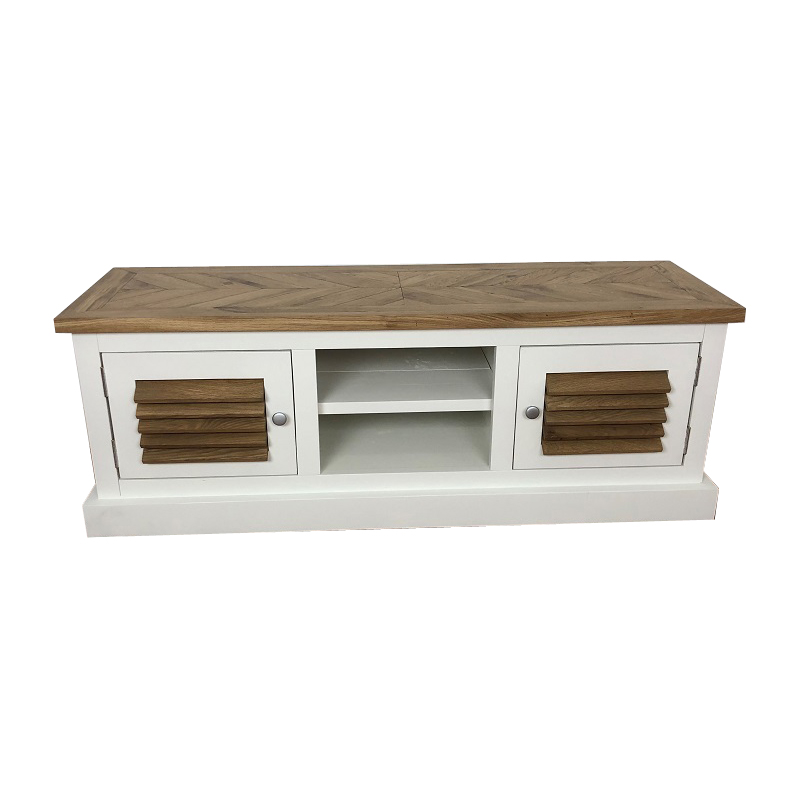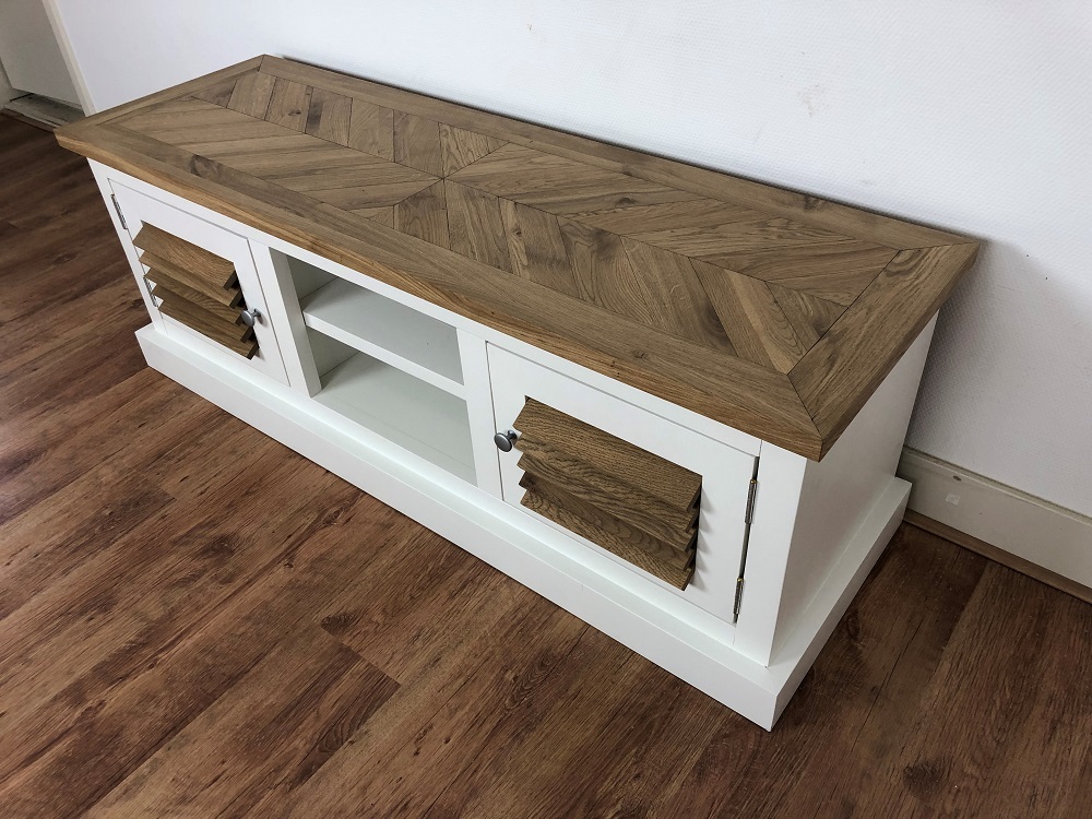 Het blad en de shutters/lamellen zijn gemaakt van eiken en het blad is gelegd in visgraat motief en behandeld in een door u gewenste kleur. De tvmeubel op de foto is behandeld met meubelolie transparant. Het onderstel is gemaakt van nieuw geschaafd hout en wit (RAL 9001) of zwart (RAL 9005) dekkend geverfd. Het meubel heeft 2 deuren afgehangen met bladscharnieren. De hoogte van de deuren zijn ca. 29cm.