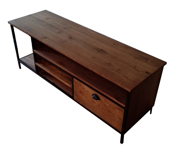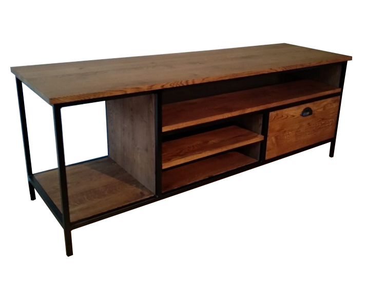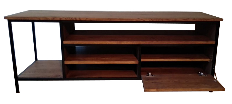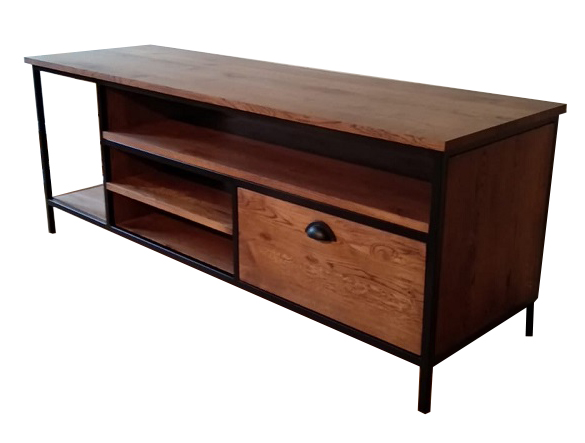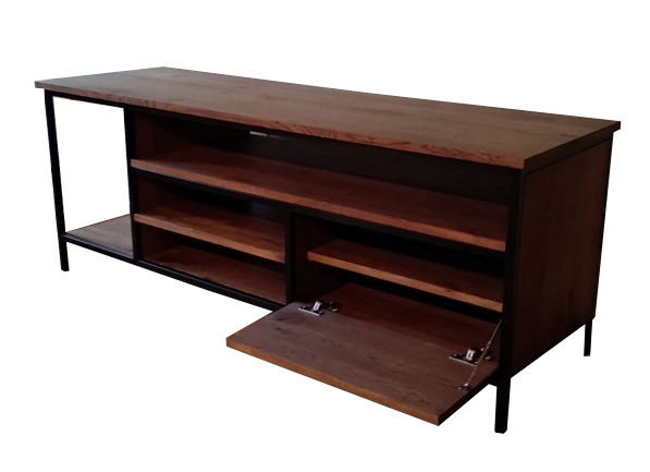 Het blad is gemaakt van 2 cm eiken en behandeld in een door u gewenste kleur. De tvmeubel op de foto is behandeld met waxoil 3167 English Color. Het onderstel is gemaakt van 2 x 2 cm staal en kan gespoten worden in Wit (RAL 9010), Grijsbeige (RAL 1019), Parelgoud (RAL1036), Chocoladebruin (RAL 8017), Olijfgroen (RAL 7002), Parelmoergrijs (RAL 1035), Ombergrijs (RAL 7022) en Zwart (RAL 9005). Het meubel heeft 1 klepdeur en 4 open vakken. Achter de klep zit een legplank.