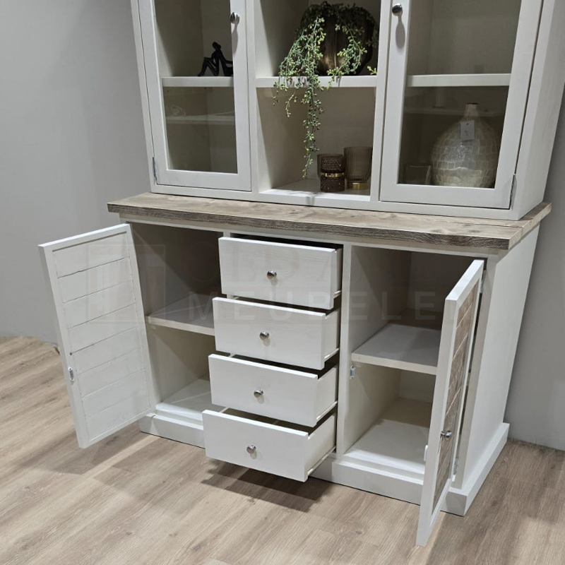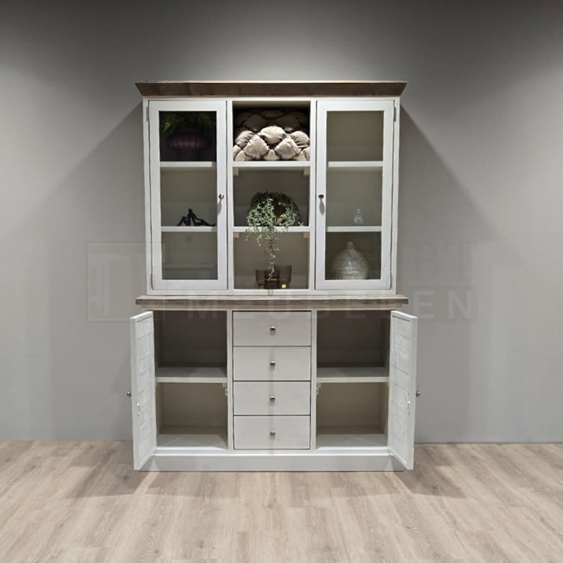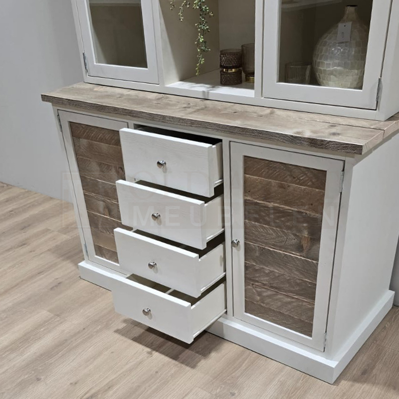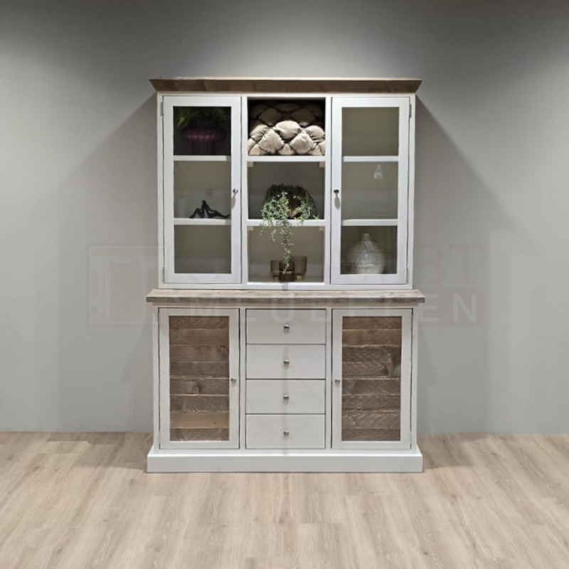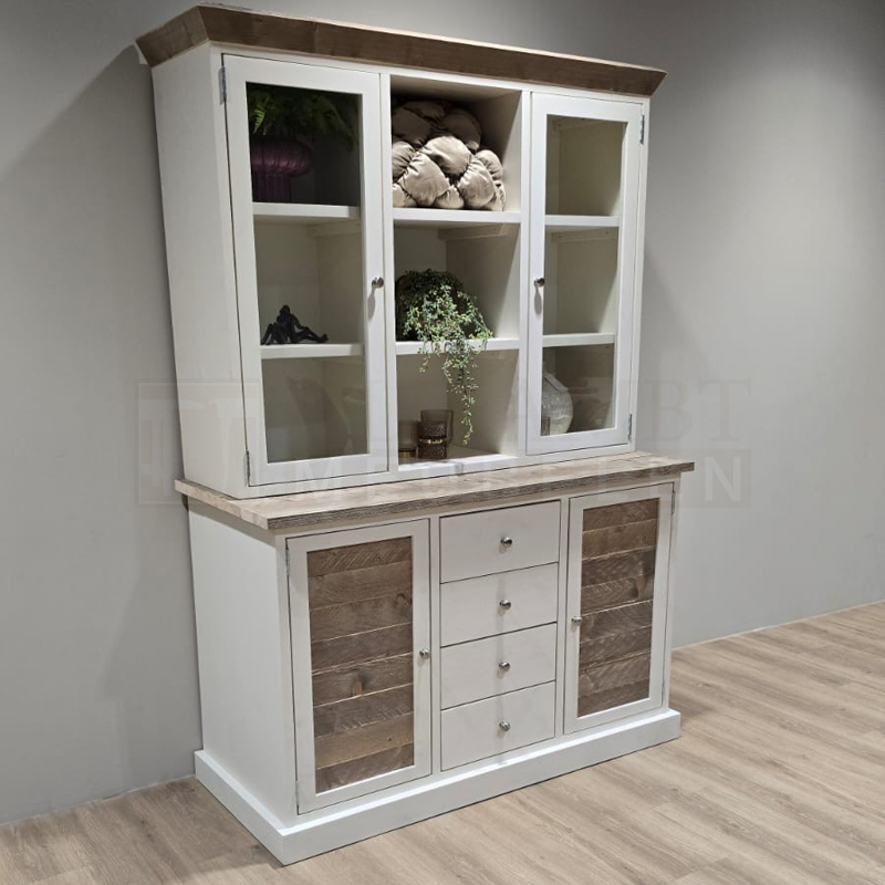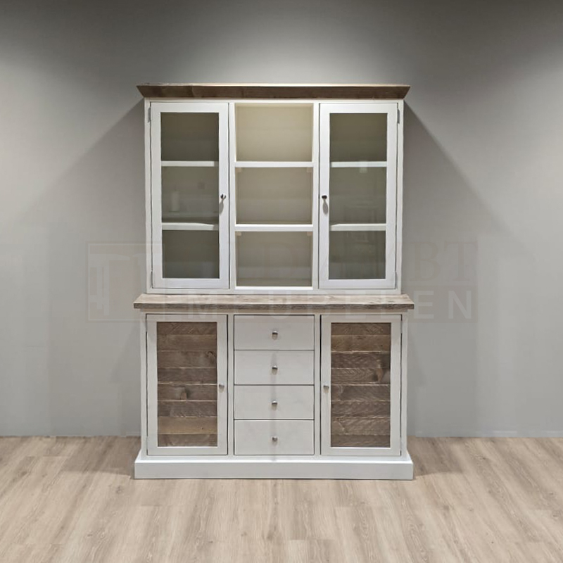 Het frame van de kast is gemaakt van nieuw geschaafd steigerhout en kan wit (RAL 9001) of zwart (RAL 9005) dekkend geverfd. De kast heeft vier deuren waarvan twee deuren met glas en twee deuren met inliggende oude panelen. In het midden van de onderste kast zitten vier laden. Voor de laden zijn standaard ladegeleiders gebruikt. Voor de deuren standaard bladscharnieren.