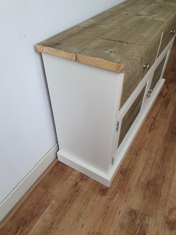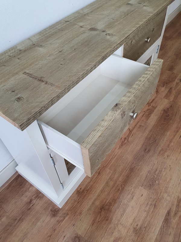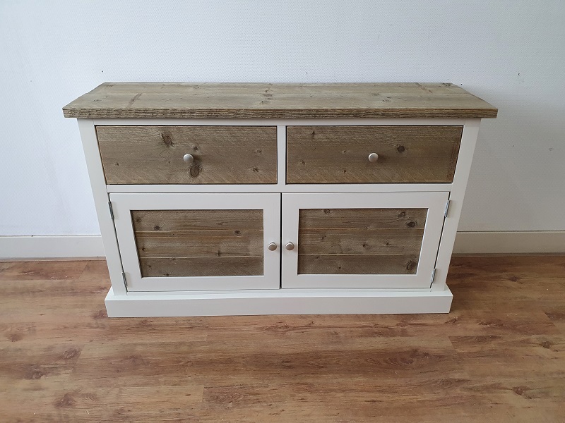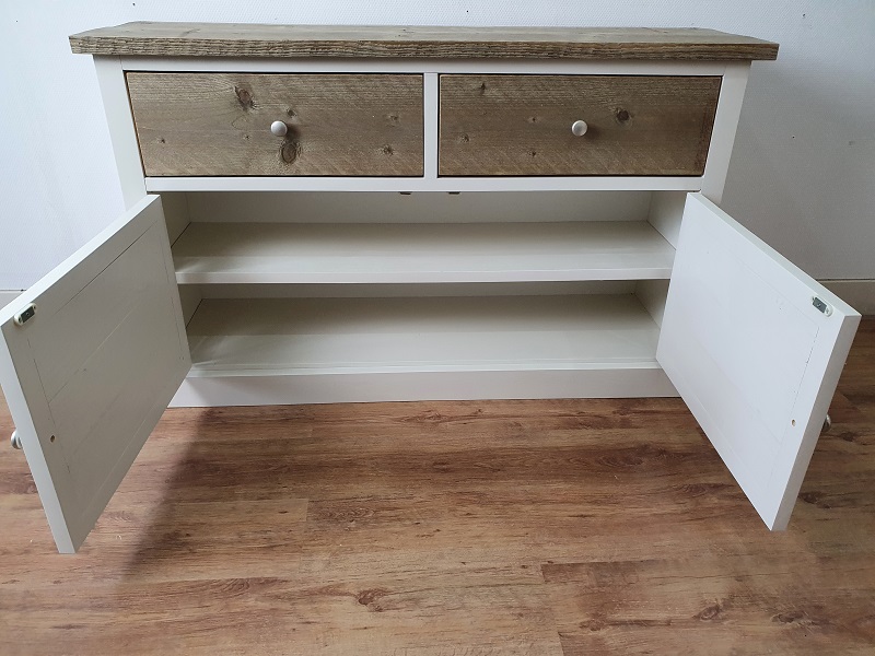 Dit dressoir is gemaakt van oud en nieuw geschaafd hout. Het frame kan wit (RAL 9001) of zwart (RAL 9005) dekkend geverfd. Het blad, de lades aan de voorzijde en de deurpanelen worden behandeld met een transparante lak. Achter de deuren komt 1 legplank.