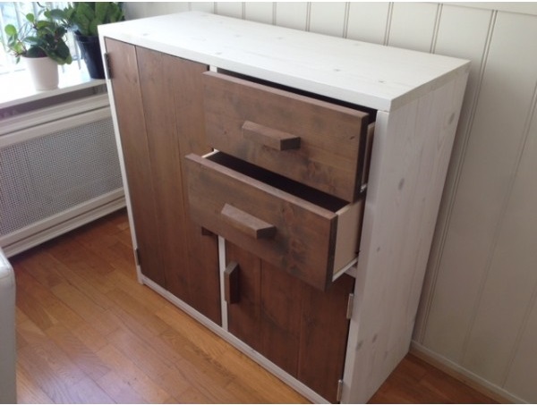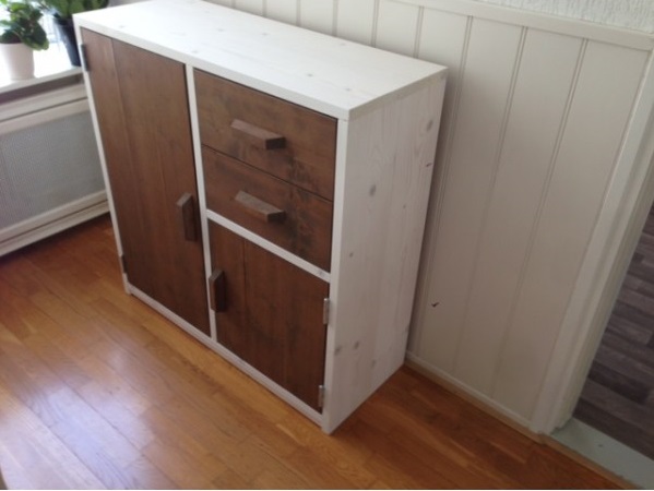 Deze kast is gemaakt van nieuw geschaafd steigerhout, het frame kan behandeld worden in een door u gewenste kleur. De kast op de foto is behandeld met meubelolie wit (beschermlaag tegen vochtvlekken/kringen). De kast heeft twee deuren en twee laden, de fronten van de deuren en laden kunnen behandeld worden in een door u gewenste kleur. Op de foto zijn ze behandeld met meubelolie nostalgie.