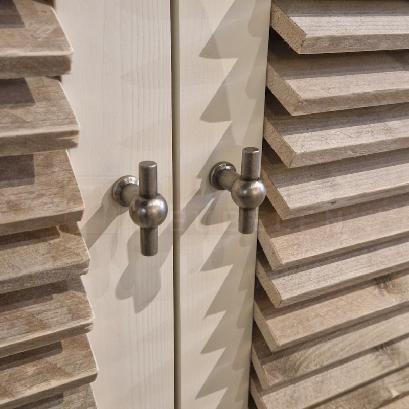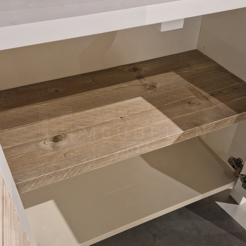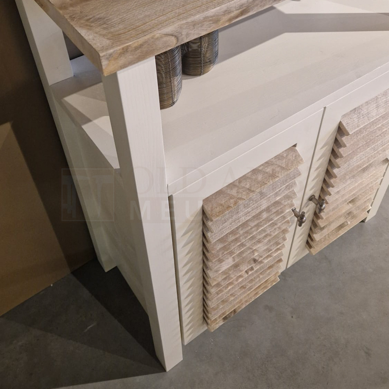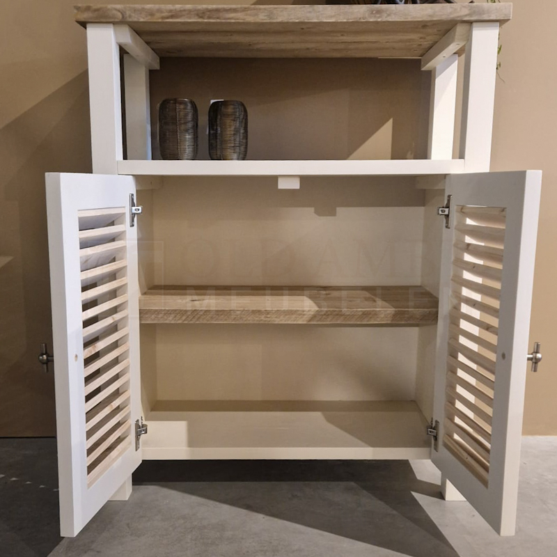 Het blad en shutters zijn gemaakt van oud steigerhout en behandeld met een transparante lak (beschermlaag tegen vlekken en kringen). Het onderstel is gemaakt van nieuw geschaafd hout en kan wit (RAL 9001) of zwart (RAL 9005) dekkend geverfd.