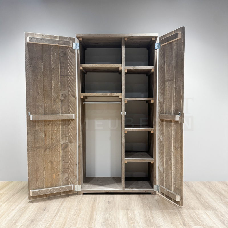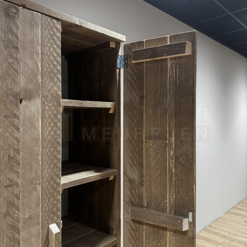 De kast is gemaakt van oud steigerhout. De kast heeft 2 deuren met daarachter aan de rechterzijde 4 legplanken en aan de linkerzijde een legplank met roede.