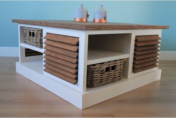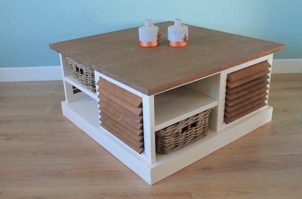 Salontafel Charlotte – Nostalgie. Het blad is gemaakt van nieuw geschaafd steigerhout en is behandeld met meubelolie Nostalgie (beschermlaag tegen vochtvlekken/kringen). Het onderstel is gemaakt van nieuw hout en wit (RAL 9001) of zwart (RAL 9005) dekkend geverfd.