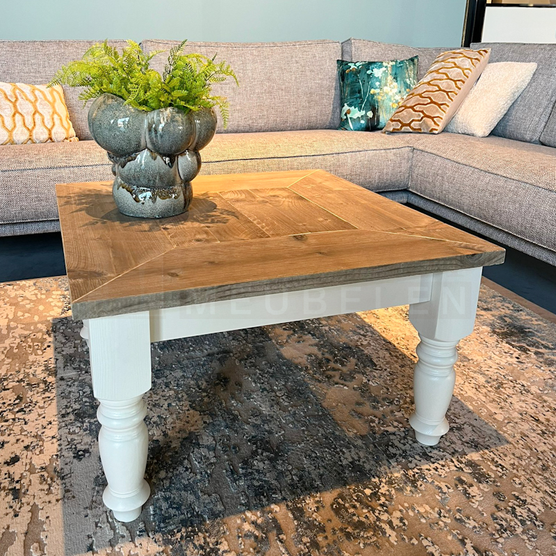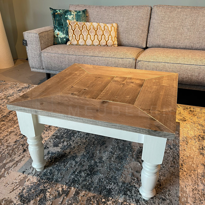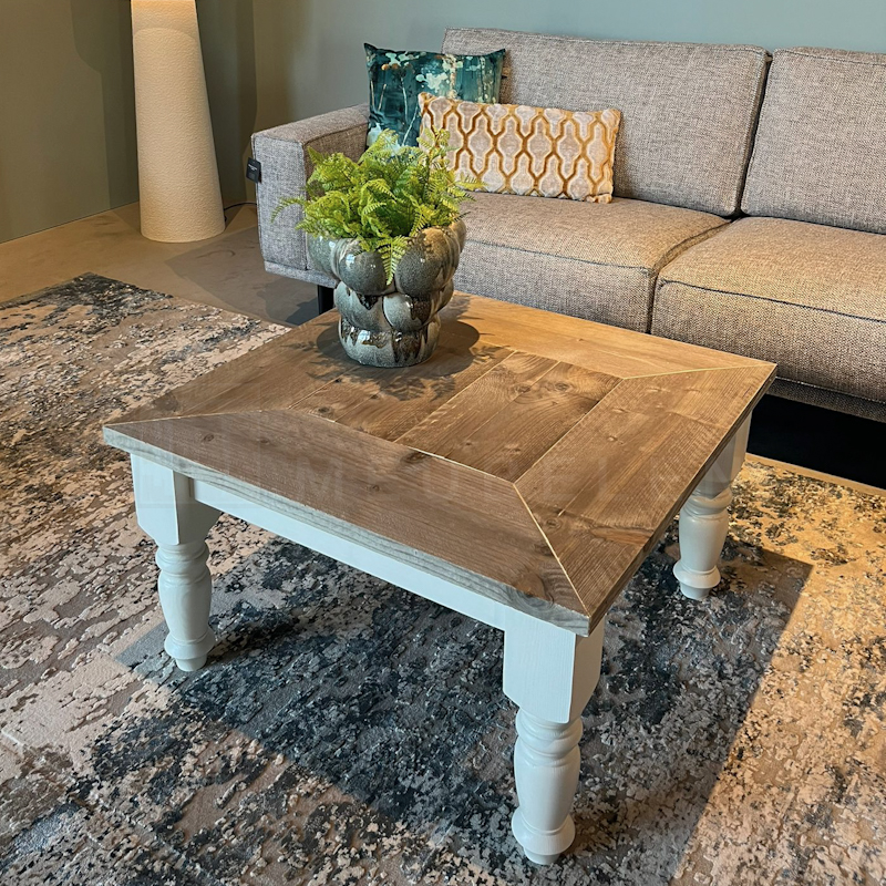 Het blad is gemaakt in verstek van oud steigerhout en behandeld met een transparante lak (beschermlaag tegen vochtvlekken/kringen). Het onderstel is gemaakt van nieuw hout en wit (RAL 9001) of zwart (RAL 9005) dekkend geverfd.