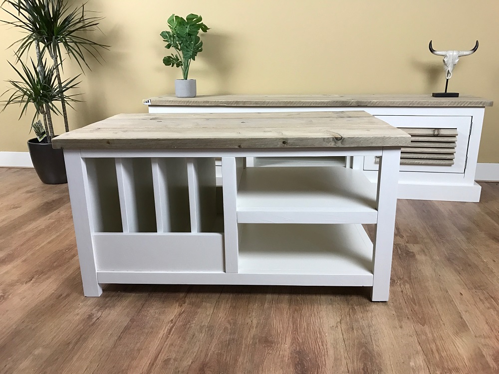 Het blad is gemaakt van oud steigerhout en behandeld met een transparante meubelolie (beschermlaag tegen vochtvlekken/kringen). Het onderstel is gemaakt van nieuw hout en is wit (RAL 9001) of zwart (RAL 9005) dekkend geverfd.