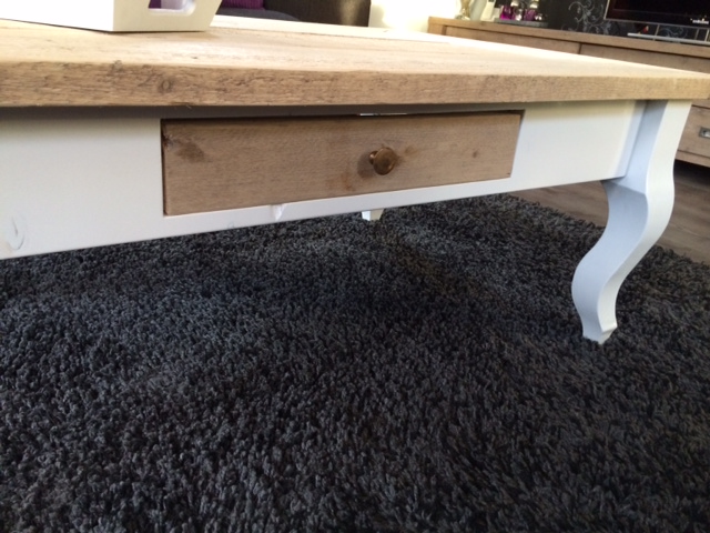 Het blad is gemaakt van oud steigerhout en behandeld met een transparante meubelolie (beschermlaag tegen vochtvlekken/kringen). Het onderstel is gemaakt van nieuw hout en is wit (RAL 9001) of zwart (RAL 9005) dekkend geverfd.