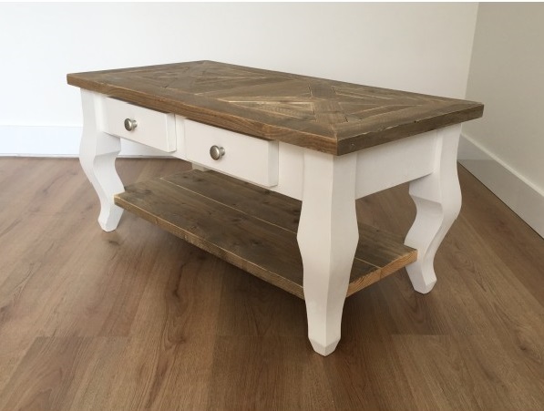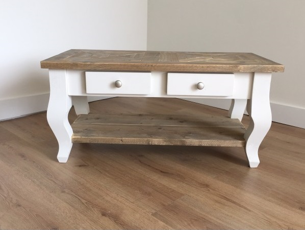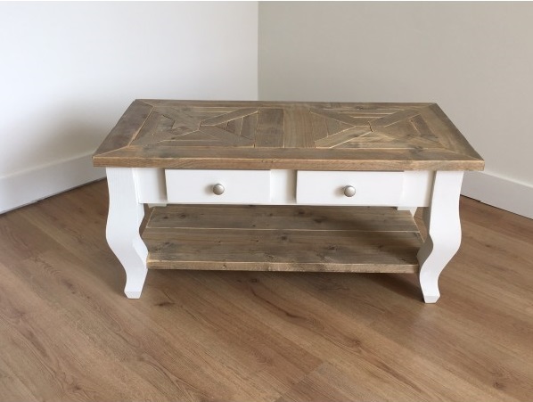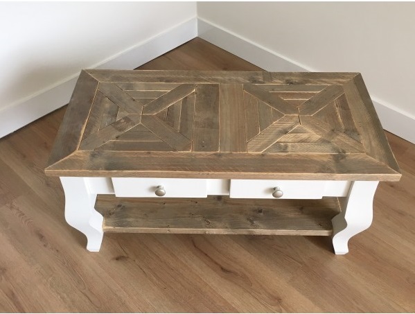 Het blad is gemaakt van oud steigerhout en behandeld met een transparante meubelolie (beschermlaag tegen vochtvlekken/kringen). Het blad heeft een mozaïek motief. Het onderstel is gemaakt van nieuw hout en is wit (RAL 9001) of zwart (RAL 9005) dekkend geverfd. De salontafel is voorzien van 2 lades die aan 1 zijde te openen zijn.