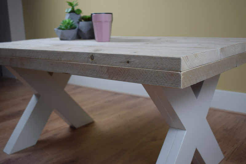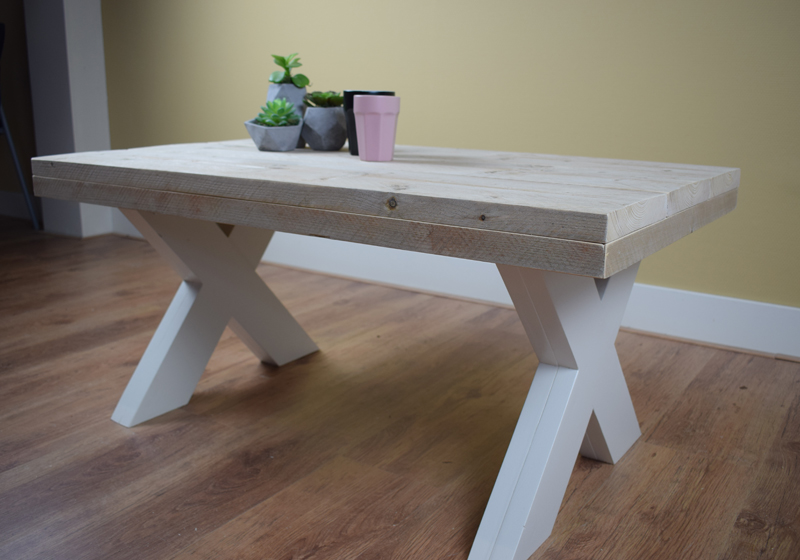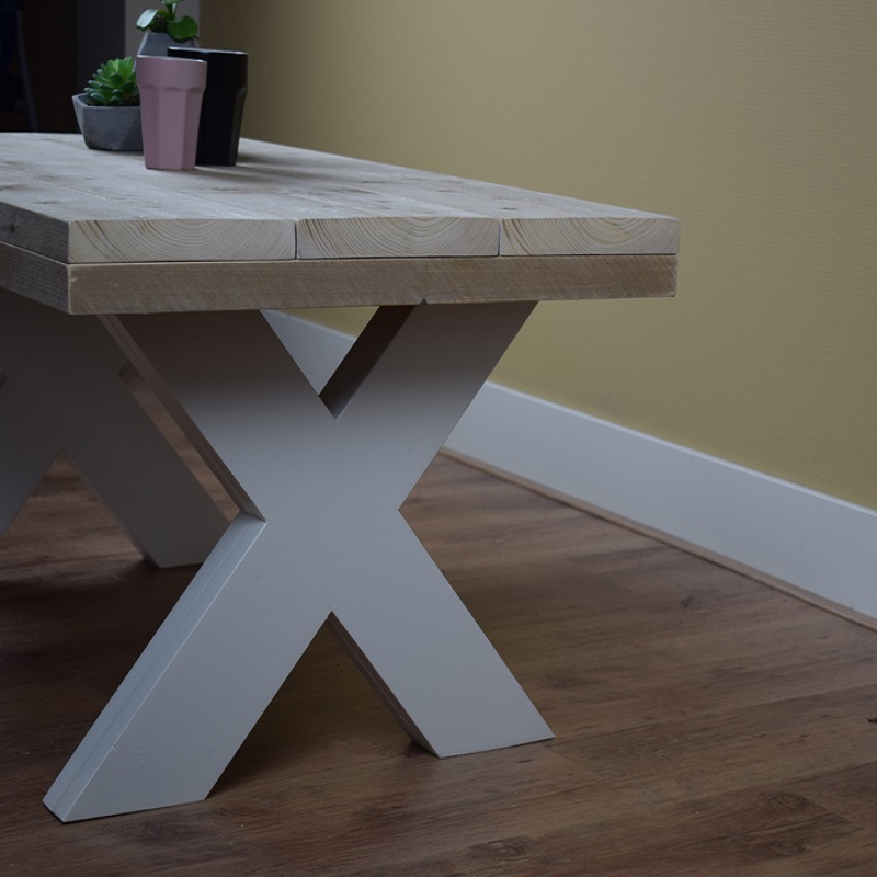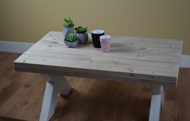 Het blad is gemaakt van oud steigerhout en behandeld met een transparante meubelolie (beschermlaag tegen vochtvlekken/kringen). Het onderstel is gemaakt van nieuw hout en wit (RAL 9001) of zwart (RAL 9005) dekkend geverfd.