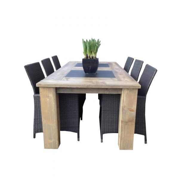 Deze tafel is gemaakt van oud steigerhout en behandeld met een matte transparante lak (beschermlaag tegen vochtvlekken/kringen), daarnaast zijn er keramische stenen verwerkt in het blad. LET OP! Doordat het keramische stenen zijn, kan de kleur afwijkend zijn van de foto. Er kunnen wat vlekken e.d. op de stenen voorkomen.