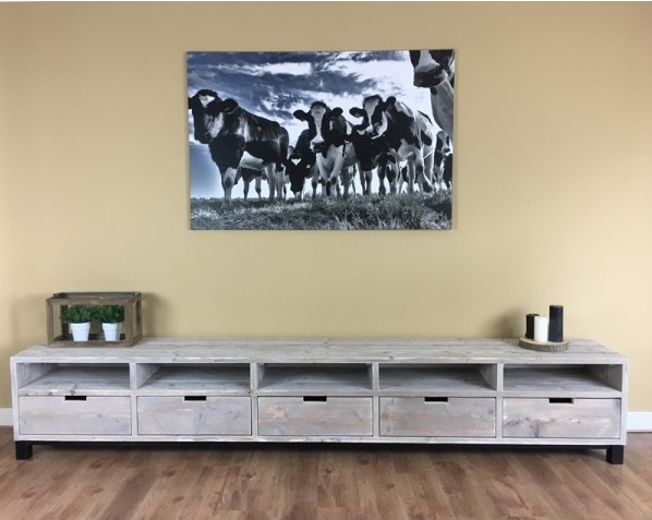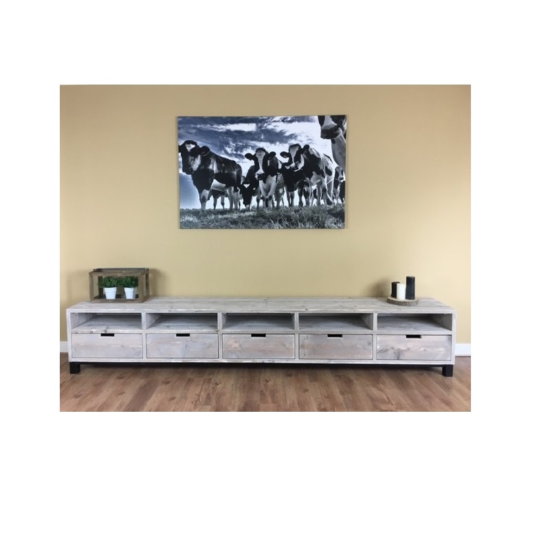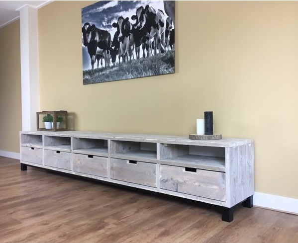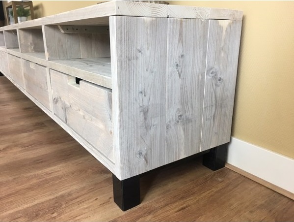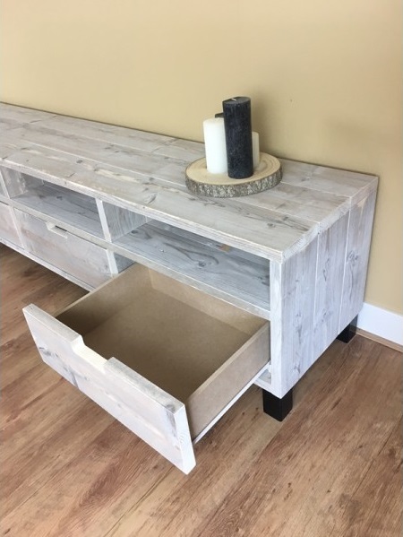 TV-Meubel gemaakt van oud steigerhout behandeld met een transparante lak. Metalen poten kunnen gespoten worden in Wit (RAL 9010), Grijsbeige (RAL 1019), Parelgoud (RAL1036), Chocoladebruin (RAL 8017), Olijfgroen (RAL 7002), Parelmoergrijs (RAL 1035), Ombergrijs (RAL 7022) en Zwart (RAL 9005).