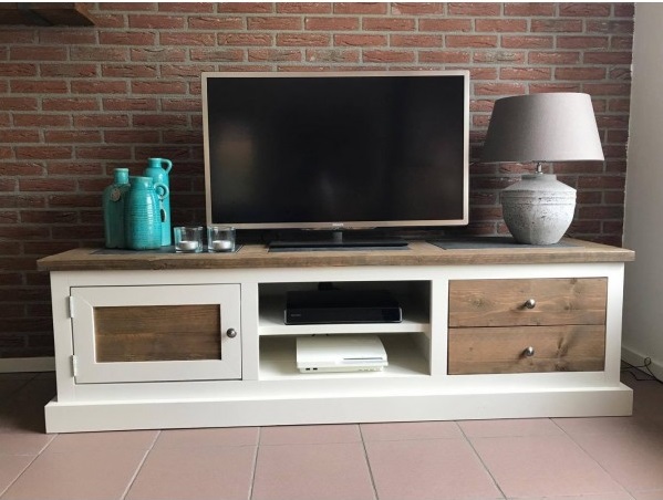 Het blad, de deuren en lades zijn gemaakt van oud steigerhout. Het frame van nieuw geschaafd hout en is wit (RAL 9001) of zwart (RAL 9005) dekkend geverfd.