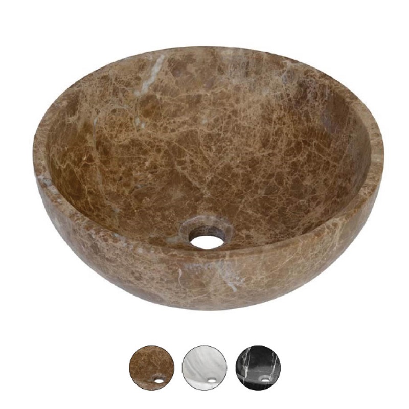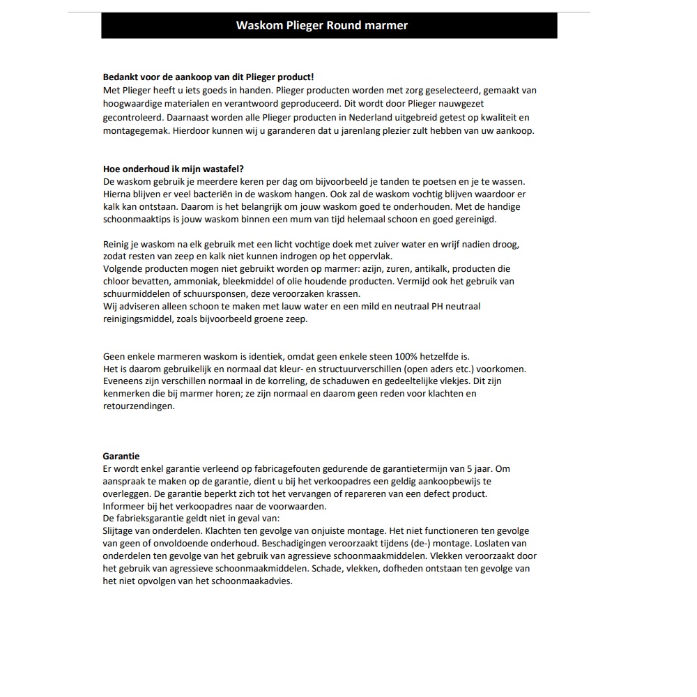 Waskom Round is geschikt voor iedere badkamer. De waskom is gemaakt van marmer en heeft een ronde vorm. Afmetingen: 38 x 38 x 12 cm. Plieger Round is verkrijgbaar in 3 kleuren keramiek: glans wit, mat wit en mat zwart en 3 verschillende tinten marmer: wit, bruin en zwart. Geen enkele marmeren waskom is identiek, omdat geen enkele steen 100% hetzelfde is. Het is daarom gebruikelijk en normaal dat kleur- en structuurverschillen (open aders etc.) voorkomen. Eveneens zijn verschillen normaal in de korreling, de schaduwen en gedeeltelijke vlekjes. Dit zijn kenmerken die bij marmer horen; ze zijn normaal en daarom geen reden voor klachten en retourzendingen.